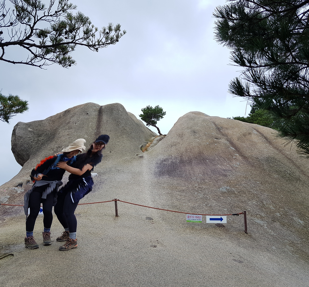말로만 듣고 사진으로만 보던 여성봉이 능선 가운데 놓여있다. 부부 산객과 모녀 산객이 여성봉을 배경으로 사진을 찍는다. 빗줄기가 굵어지자 모자 창에 땀방울 대신 빗방울이 맺힌다.