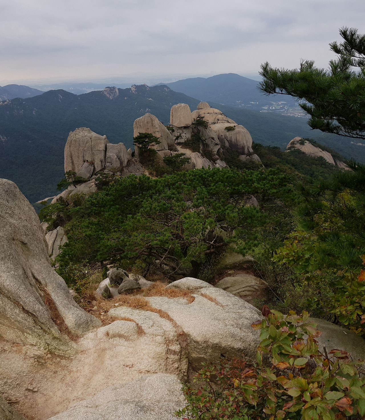 주봉과 칼바위를 비껴지나 오봉 갈림길에서 오봉능선으로 들어섰다. 오봉능선은 산객들이 뜸해서 한결 마음이 느긋하다. 오봉에 올라서니 아래쪽 짧은 능선 위에 나란히 줄지어선 오봉과 함께 멀리 북한산 관악산 등이 파노라마처럼 눈앞에 펼쳐져 있다.