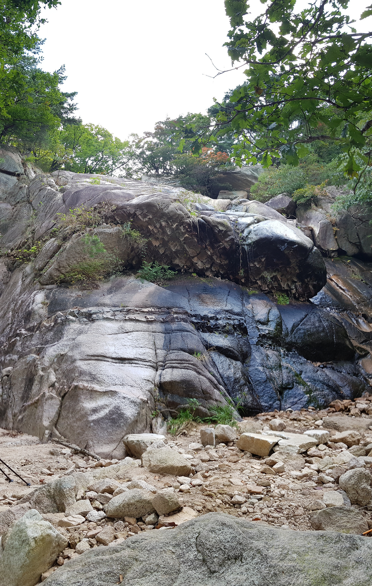 뾰족한 암봉을 높이 추켜세우고 있는 사패산을 올려다보며 물이 마른 계곡 옆 포장도로를 따라 올랐다. 한참만에 아담한 절집 원각사를 비껴지나 본격적인 등로로 접어든다. 옆으로 따라오던 계곡이 원각사 뒤편에서 한 줄기 졸졸졸 물을 떨어뜨리는 제1,2 원각 폭포를 내놓는다.