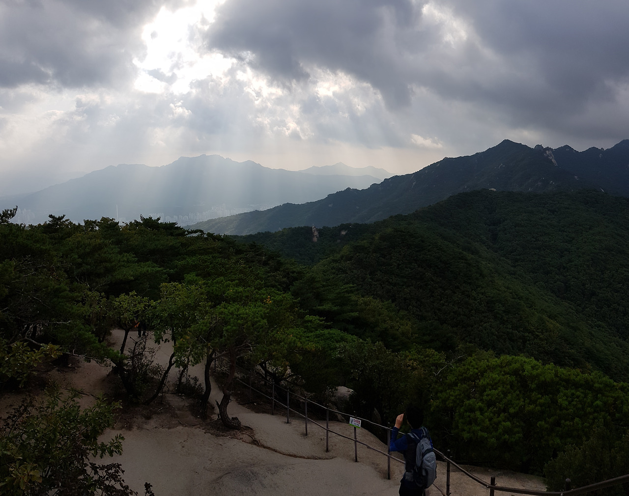 사패산 정상을 뒤로하고 3.5km 거리 도봉산 자운봉 쪽 사패능선으로 발을 옮긴다. 잿빛 구름 사이를 비집고 흰 암릉, 검푸른 능선으로 내리비치는 굵은 아침 햇살이 신비감을 자아낸다.