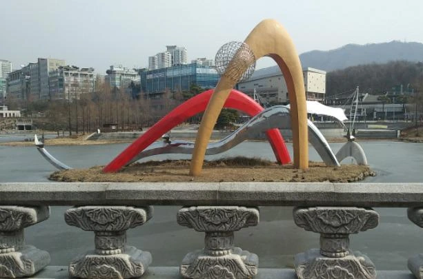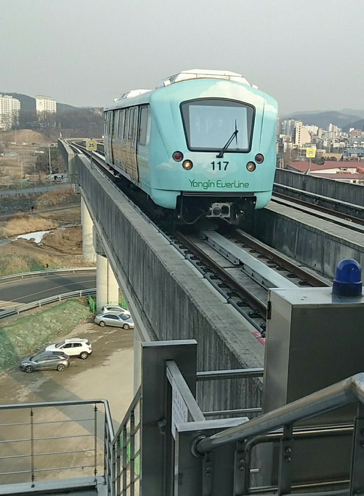 제4구간을 용인시청에서 마무리하고 번듯한 용인시청사 앞을 가로질러 그 옆 기흥과 에버랜드를 잇는 경전철 에버라인 시청•용인대 역으로 갔다. 지상 고가철로 위를 달리는 경전철은 일반 전철보다 폭이 좁고 길이도 전철 한 량 정도로 아담하다.
