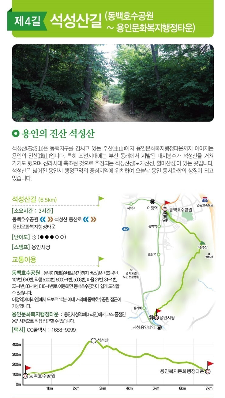 영남길 제4구간 석성산길로 접어들었다. 동막과 백현이 합쳐져 생긴 동백리의 호수공원 옆 근린공원에서 시작하여 석성산을 지나 용인시청에 닿는 6km여 구간이다.