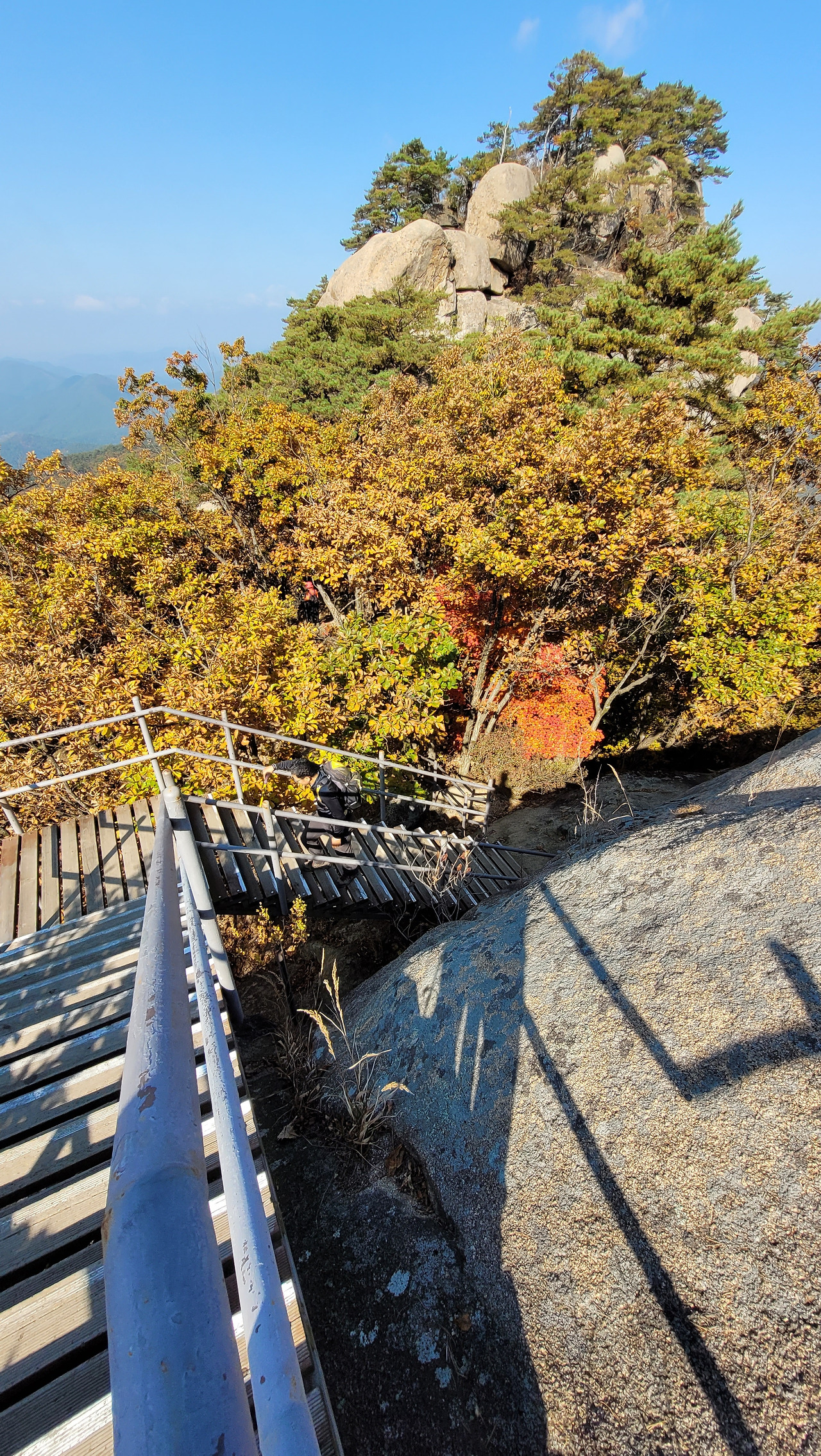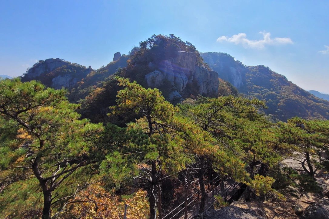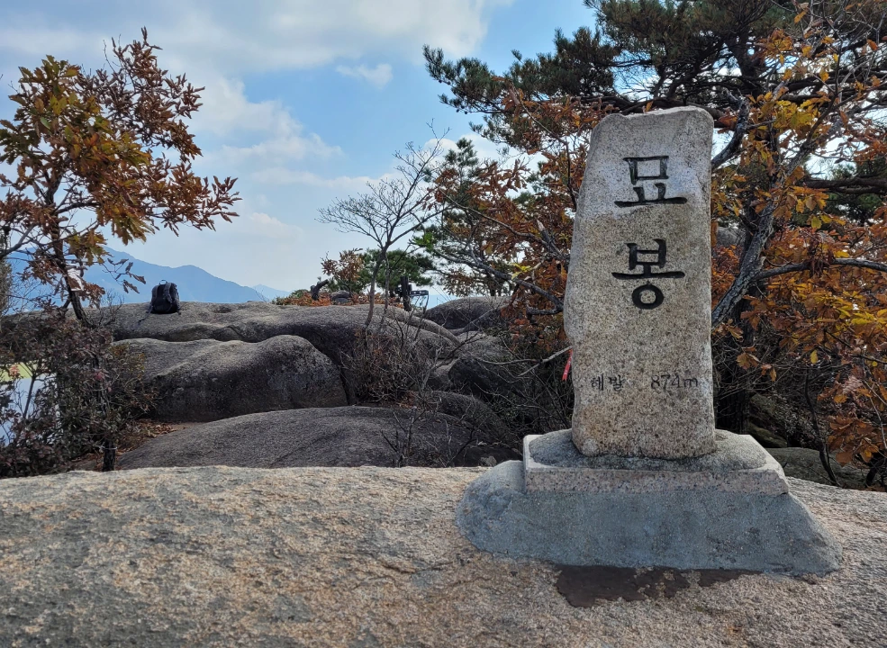 묘봉 정상으로 지그재그로 놓인 계단은 고층건물 공사장의 비계처럼 단풍이 물들기 시작한 숲과 어우러져 특이한 풍경을 연출한다. 해발 874미터 묘봉 너럭바위가 가파른 능선 한쪽을 온전히 차지하고 조망을 펼치고 있다. 무채색 암봉, 울긋불긋한 능선, 파란 하늘, 하얀 구름 등이 어우러져 그려내는 풍경은 말로 다 담아내기 어려운 장관이다.