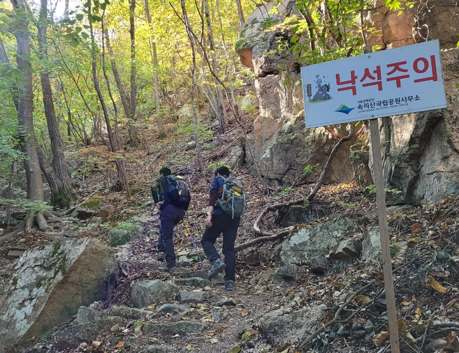 마을 뒤 들머리로 가는 골목에 국립공원공단 직원 한 분이 산객을 맞이하며 예약 여부를 확인하고 코로나 19 방역수칙 준수도 다짐받는다.