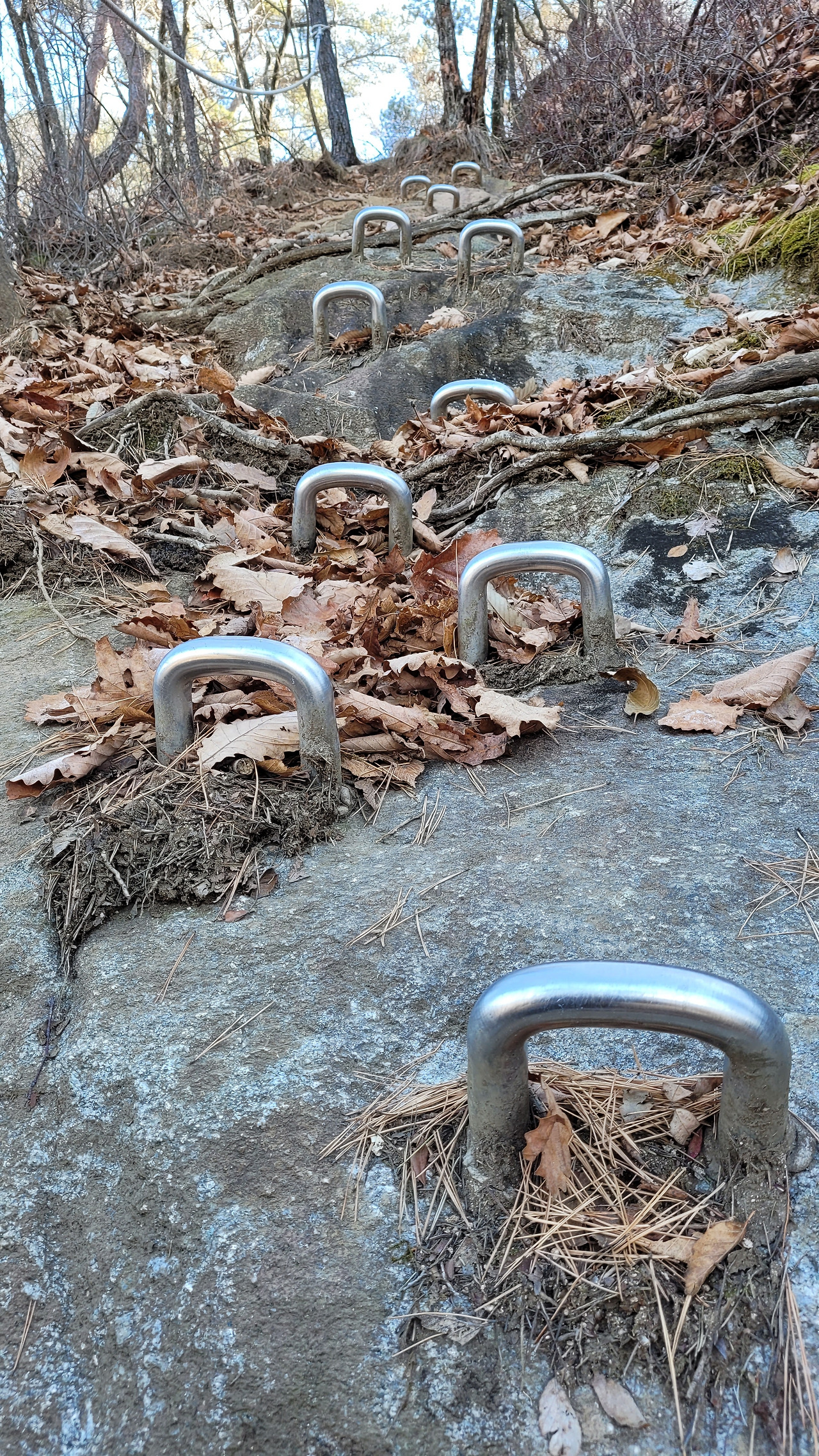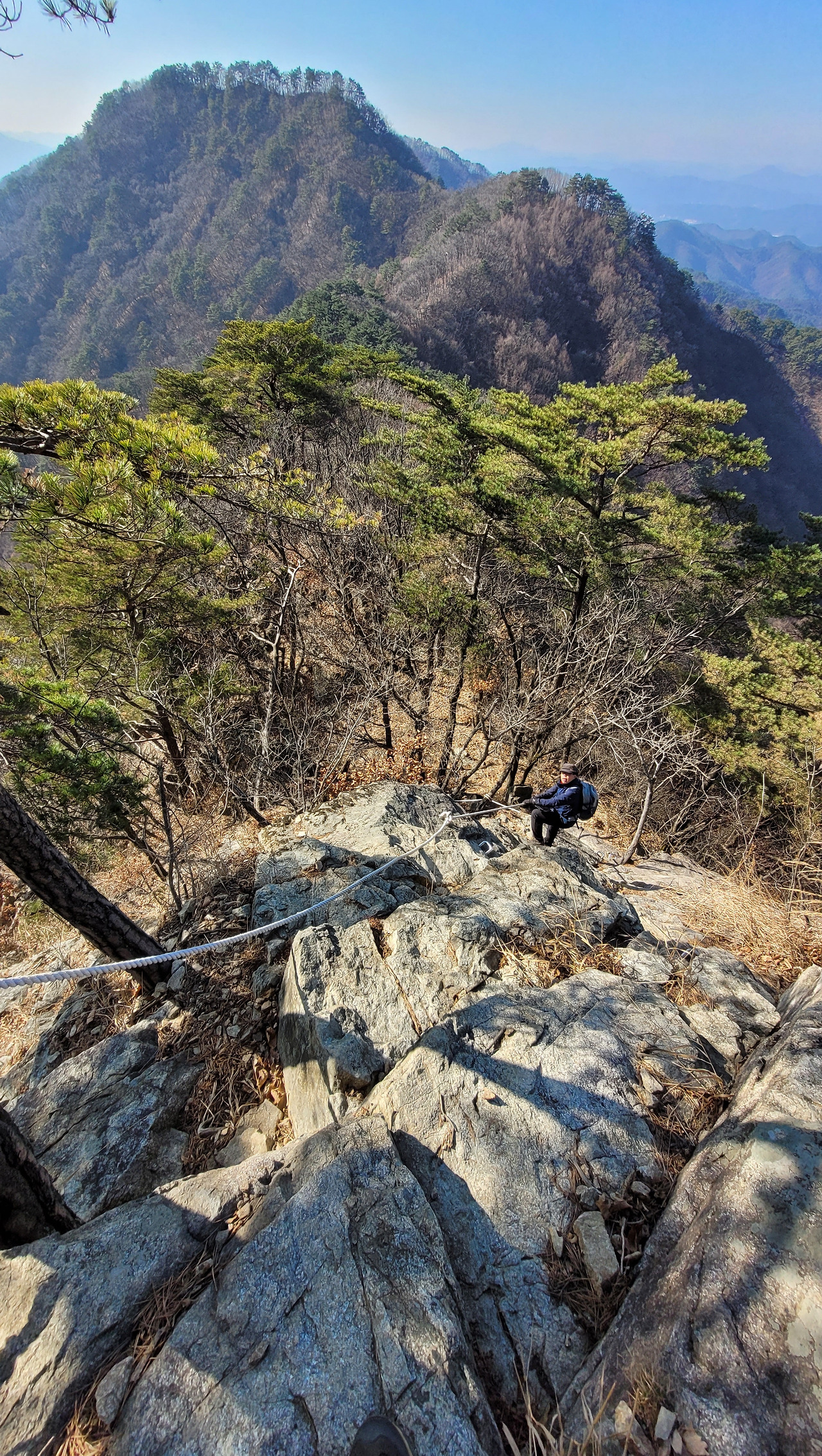 공작산 정상에서 약 2km 지점의 해발 820미터 수리봉으로 오르내리는 좌우 등로는 거칠다. 스테이플러 심처럼 생긴 철심이 박히고 밧줄이 걸린 암벽, 안전 로프가 쳐진 낭떠러지 옆 좁은 능선, 무릎 높이까지 푹푹 빠지는 낙엽 등 만만찮은 길이 긴장을 놓지 않게 한다.