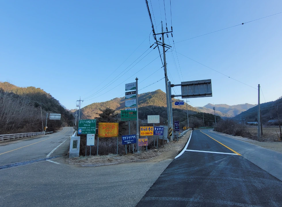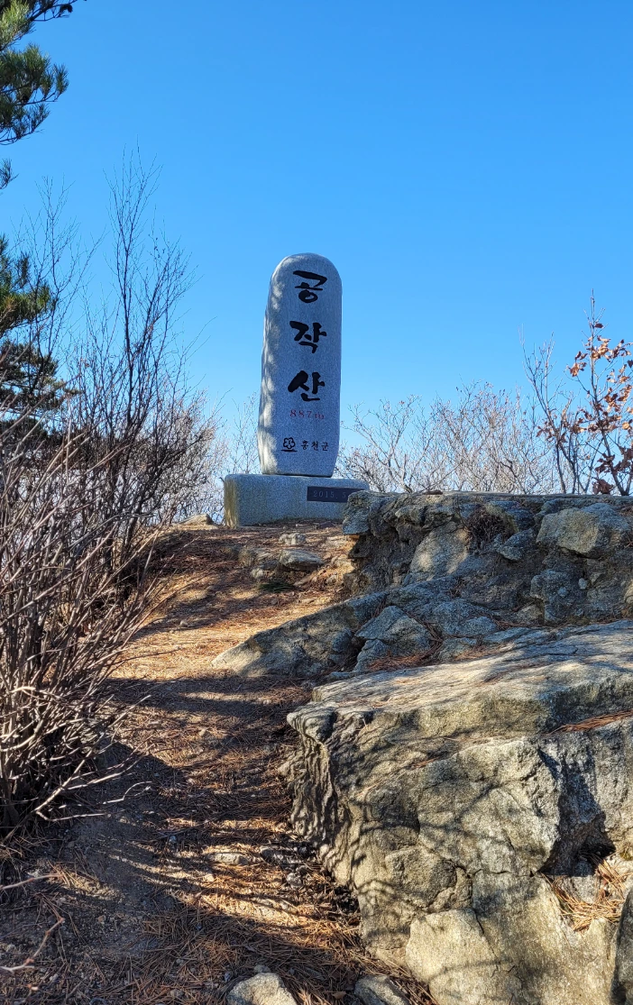 앙상한 가지를 드러낸 참나무들이 조용히 동면 채비를 하는 가파른 비탈을 오르며 폐 깊숙이 들이쉬는 공기가 더없이 청량하다. 가파른 비탈을 지나 우측 능선 마루로 올라서니 우측 아래 산줄기 속에 파묻힌 공작현 고갯길이 화촌면 쪽으로 끊어질 듯 띄엄띄엄 이어져 있다.