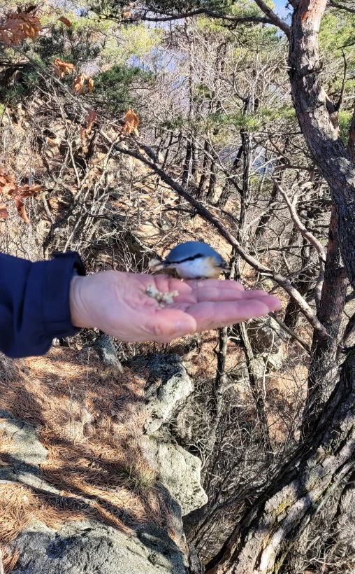 정상 바로 아래 암릉에서 작은 새 한 마리가 우리 주변을 맴돌다가 가까이 다가온다. 얼른 등을 내미는 친구 배낭에서 잡곡 과자 하나를 꺼내어 입으로 씹어 부순 후 손바닥 위에 올려놓고 팔을 내밀었다. 손바닥 위로 내려앉아 한닙 쪼고 나뭇가지로 날아갔다가 다시 돌아오는 녀석이 기특하다는 생각이 들기도 하고, 한편으론 다가올 겨울이 걱정되기도 한다.