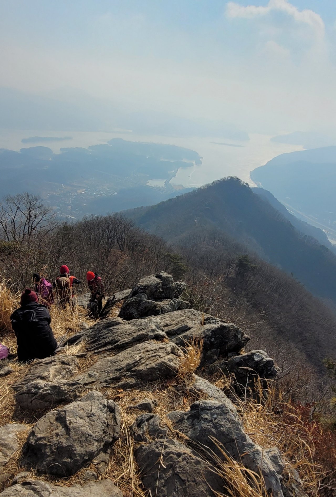 견우봉 아래 바람이 없는 아늑한 곳에 바스락대는 낙엽을 치우고 앉아 따뜻한 물에 누룽지를 불리고 떡, 곶감, 바나나, 귤, 빵 등을 배낭에서 꺼내 출출해하는 배를 달랬다. 고도를 낮춰가던 능선이 마지막으로 해발 474m 승원봉을 내놓으며 팔당호 쪽으로 가파르게 내리 닿는다. 능선 좌측의 더없이 아늑해 보이는 성당 공원묘원 위쪽 가장자리를 지나면 그 오른편으로 절벽처럼 뚝 끈긴 능선 아래로 팔당댐이 한눈에 굽어 보인다.