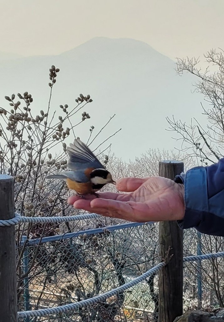 저번 홍천의 공작산 정상부에서 만났던 녀석과 같은 모습의 새 두세 마리가 주위를 맴돈다. 딱새인지 박새인지 아니면 곤줄박이인지 알 수가 없으니 우리 주변의 흔한 텃새에 대한 무관심을 스스로 탓해 본다. M에게 얼른 견과를 꺼내어 손 위에 올려놓으라 주문했다. 주린 배 때문에 두려움을 내려놓은 듯 연신 번갈아 가며 손바닥 위를 오가는 녀석들이 안쓰럽다.