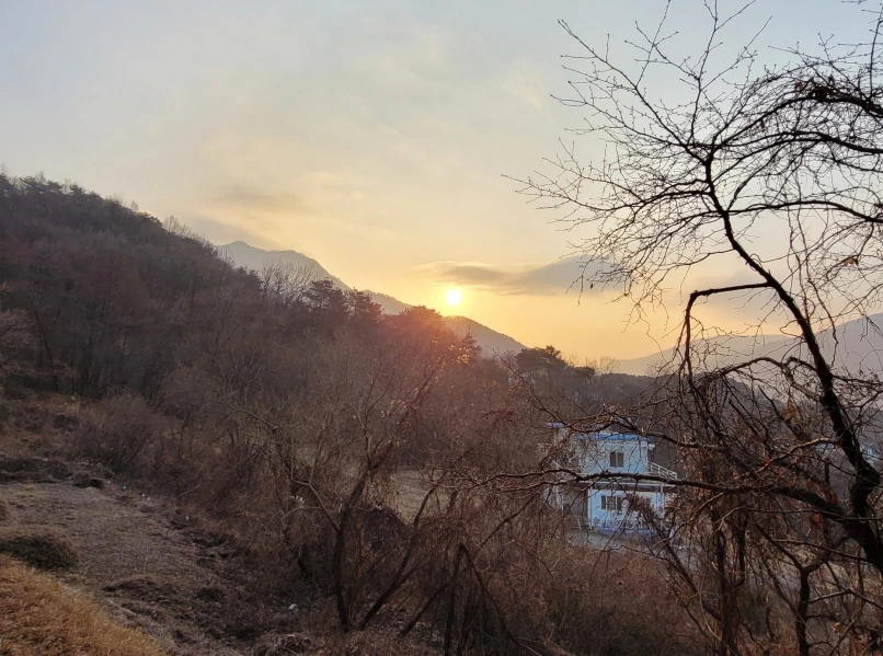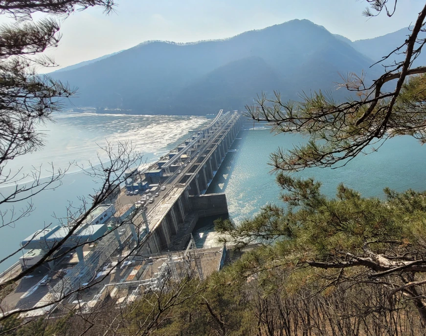차고 신선한 아침 공기를 폐 깊숙이 들이쉬며 가파른 경사를 치고 오르기 시작했다. 게으른 겨울 태양이 한강 쪽으로 내리 닿는 예빈산 줄기 위로 부스스 얼굴을 내밀고 있다. 성긴 노송 숲을 지나고 고도가 높아지며 드르럭 대는 굴착기 소리, 기차 바퀴 구르는 소리, 차량 웅웅 대는 소리 등은 점점 멀어져 가고 팔당대교와 좁은 댐에 갇혔다가 해방된 한강의 넓은 물길이 한눈에 들어온다.