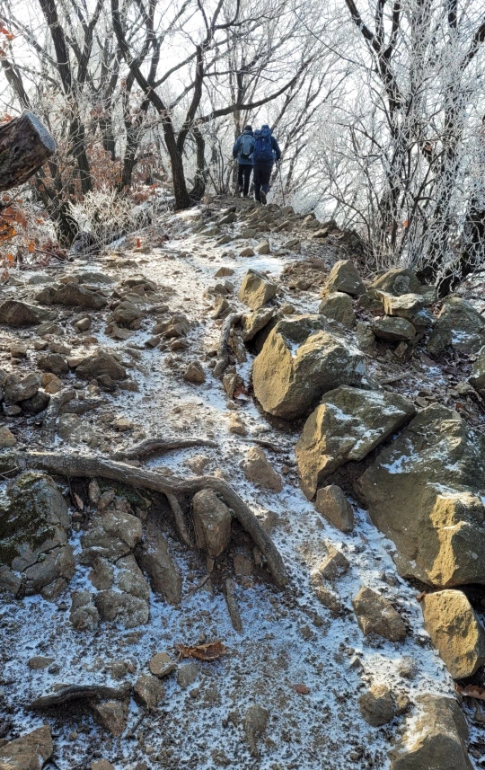 바람을 타고 능선으로 오르던 안개가 밤새 차가워진 공기 때문에 나뭇가지에 곧바로 얼어붙는 승화(desublimation) 현상을 통해 저리 환상적인 모습을 만들어 냈을 것이다. 예봉산 쪽 능선을 따라 걸으며 친구들과 함께 연신 감탄사를 내뱉으며 연신 스마트폰 셔트를 눌렀다.