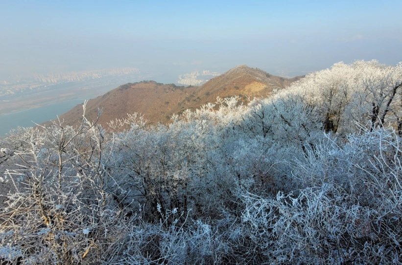 상고대 터널을 지나고 철문봉과 예봉산을 잇는 능선 안부의 억새밭을 지나 돔형 지붕이 인상적인 기상관측소가 자리한 해발 683m 예봉산 정상에 올라섰다. 관측소 뒤로 기세가 오른 태양이 강한 햇빛을 내리치고 있다. 뒤쪽 서편은 너른 나무데크 난간 너머로 백옥같이 흰 상고대를 이고 있는 숲과 그 너머로 황갈색 낙엽과 짙푸른 소나무 숲이 또렷한 경계를 이루고 있는 모습이 경이롭다.