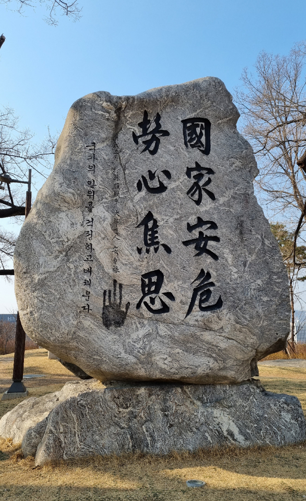 숭례문을 뒤로하고 남산 자락으로 접어들어 성곽을 따라 오른다. 아동광장, 백범광장, 목멱산 봉수터, 서울 중심점, N타워 등 남산 곳곳은 남녀노소 상춘객들로 적지 않게 붐빈다. 하얼빈역에서 한국 식민지의 기초를 다진 통감부의 첫 통감이던 이토를 처단한 안중근 의사 동상이 의연하다. 바윗돌에 새긴 그의 글씨 '見利思義 見危授命'에서 한국사의 여러 대첩에 못지않은 장쾌한 기개가 느껴진다.