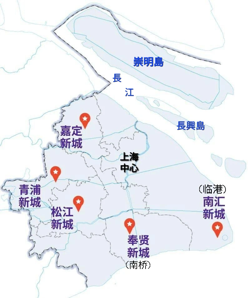 중국 최대의 위성 도시로 자리한 면적 340㎢의 린강을 비롯, 쟈딩과 송쟝 각 160㎢, 청포 90㎢, 펑셴 70㎢ 규모다. 5대 신도시의 총 인구는 360만 명, 총 GDP는 1조1천억 위안에 달하는데, 2035년까지 각각 인구 100만 여명의 독립적인 기능을 갖춘 도시로 자리할 것이라고 한다.