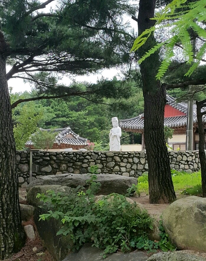 대웅전을 뒤로하고 요사채가 앞마당 한가운데를 차지하고 있는 그 절집, 양팔을 가슴 높이로 가지런히 모으고 왼쪽 손바닥 위에 보병을 받쳐 든 4~5미터 높이 순백의 대리석 관세음보살상이 시선을 끈다. 담벼락 옆으로 반듯하게 줄지어 서있는 어른 키 높이의 석조 십이지신상은 절집과는 어울리지 않은 듯한데 모습은 태연해 보인다.