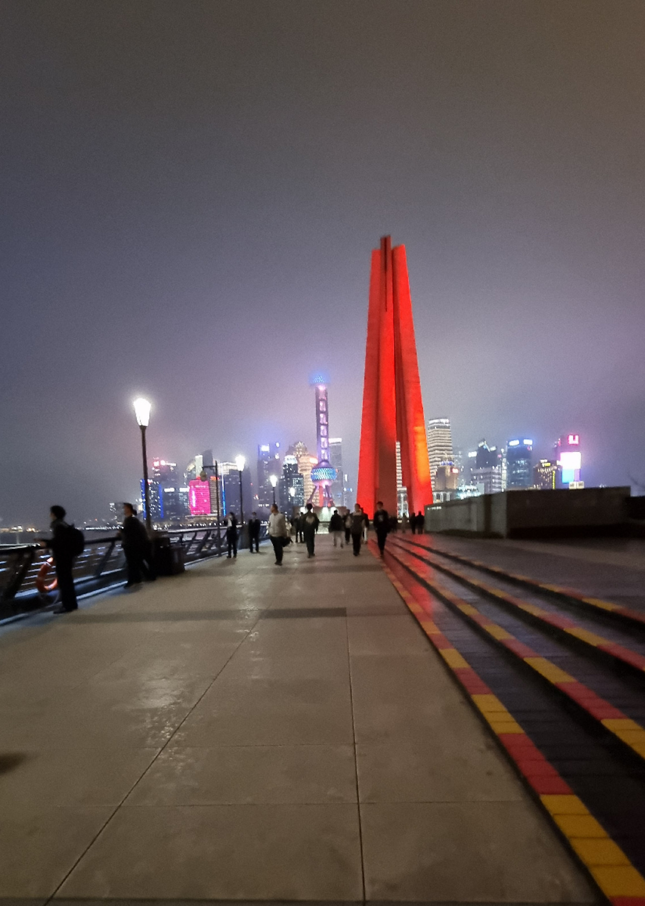 양쯔강 하구를 향해 남에서 북으로 흐르는 황푸강으로 흘러드는 우쏭강(吴淞江) 위에 놓인 와이바이두교(外白渡桥) 부근 와이탄의 끝으로 거슬러 올라갔다. 다리 옆 가까이에 조명을 받아 선홍색 빛을 띤 상해시인민영웅기념탑이 아편전쟁과 5.4 운동 등에 희생된 중국 열사들을 기리며 우뚝 솟아 있다. 황푸강 건너편에는 동방명주 탑과 고층 건물군은 운무 속에 여러 색깔 조명을 받으며 신비롭게 형체를 드러내고 있다.