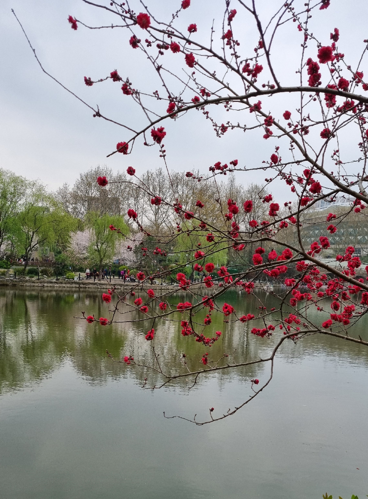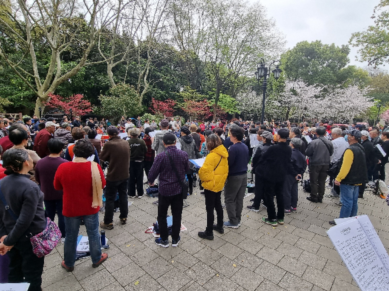 매원에서 공원으로 나오니 상춘객들로 북적이는 산책로, 벤치들을 채운 사람들, 배드민턴을 치거나 간이 체육시설에서 운동을 하는 사람들, 빙 둘러서서 아코디언 북 하모니카 반주에 맞추어 합창을 하는 수백 명의 사람들 등 각양각색 만개한 봄꽃처럼 다채롭지만 자연 스레 어우러진 모습이 오히려 이채롭게 느껴진다.