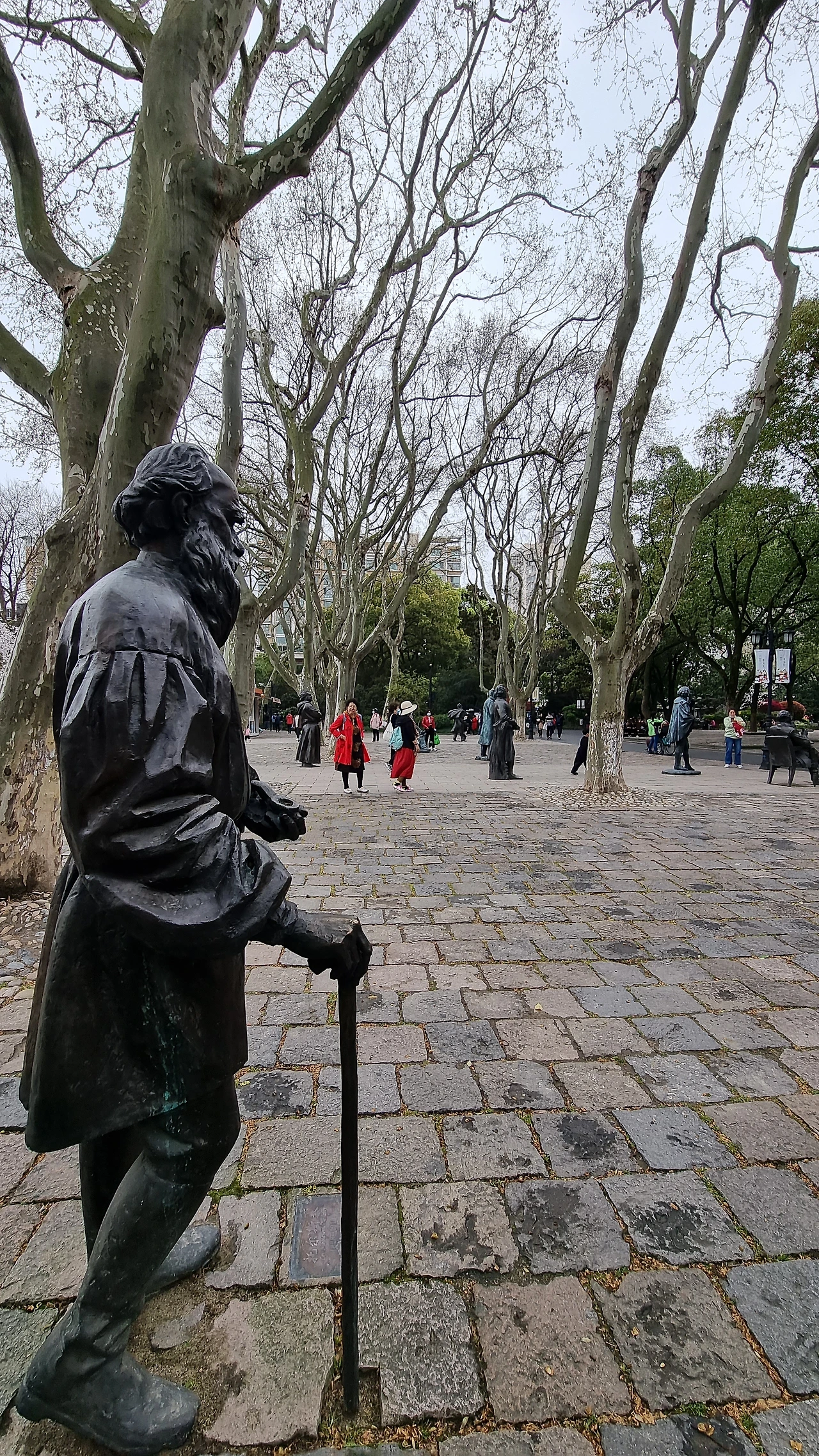 공원의 남쪽 정문의 오른편으로 걸음을 옮기면 푸쉬킨 단테 위고 고르키 셰익스피어 디킨스 발작 톨스토이 등 대문호들의 동상이 널찍한 거리를 두고 아름드리 나무들 사이에 서있는 세계 문호 광장이 맞이 한다.