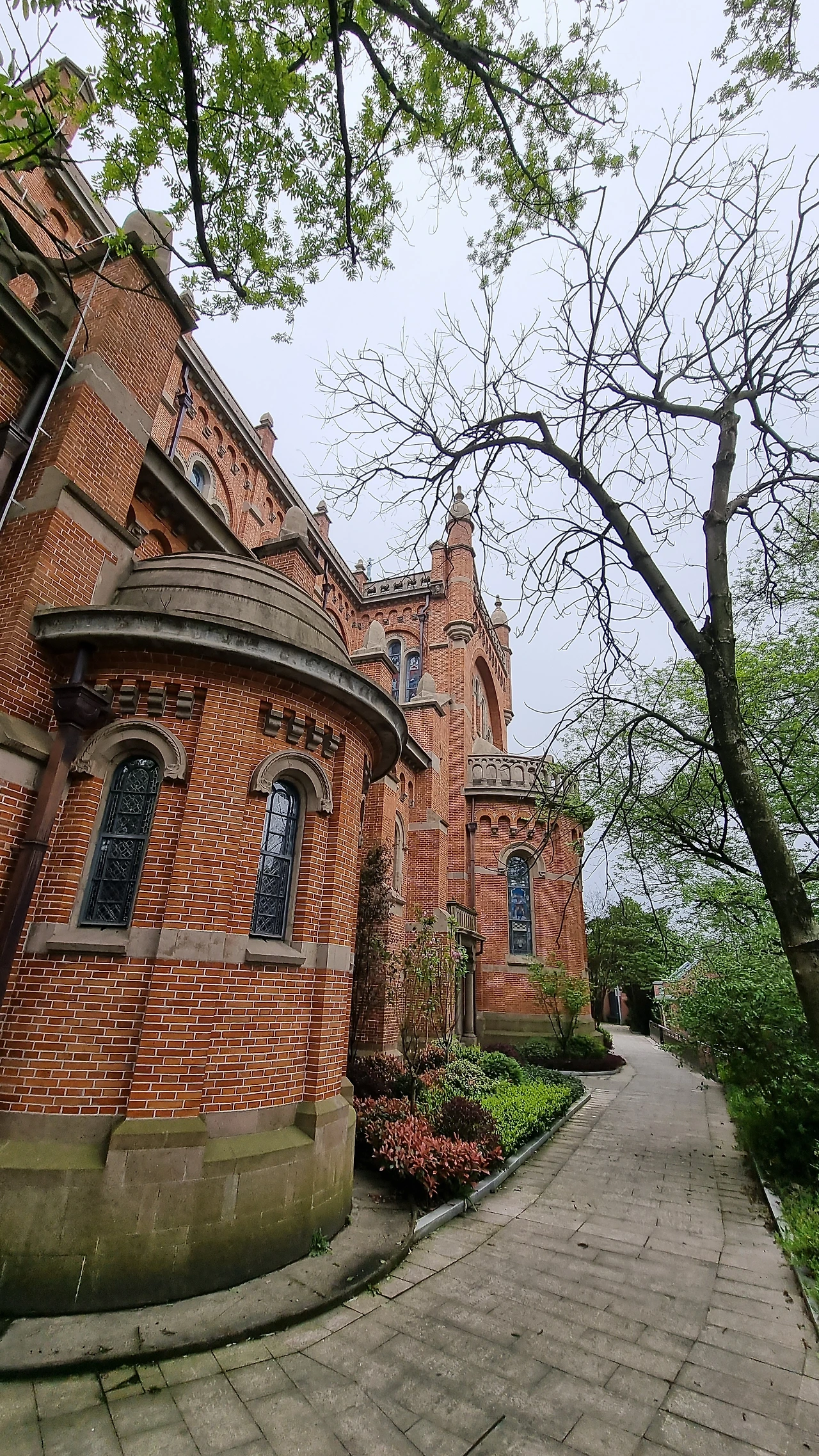 산허리를 휘돌아 정상부에 오르면 프랑스 선교사에 의해 1874년 시건 되고 1935年 중건된 성모 대교당이 자리한다. 문이 잠겨 있어 들어갈 수 없는 붉은 벽돌로 지은 성당은 고성처럼 당당하고 고풍스럽다. 나무, 못, 철강, 들보를 쓰지 않은 4무(無) 기법과 비대칭 구조로의 이 성당은 당시 건축양식의 전범(典範)이라고 한다.