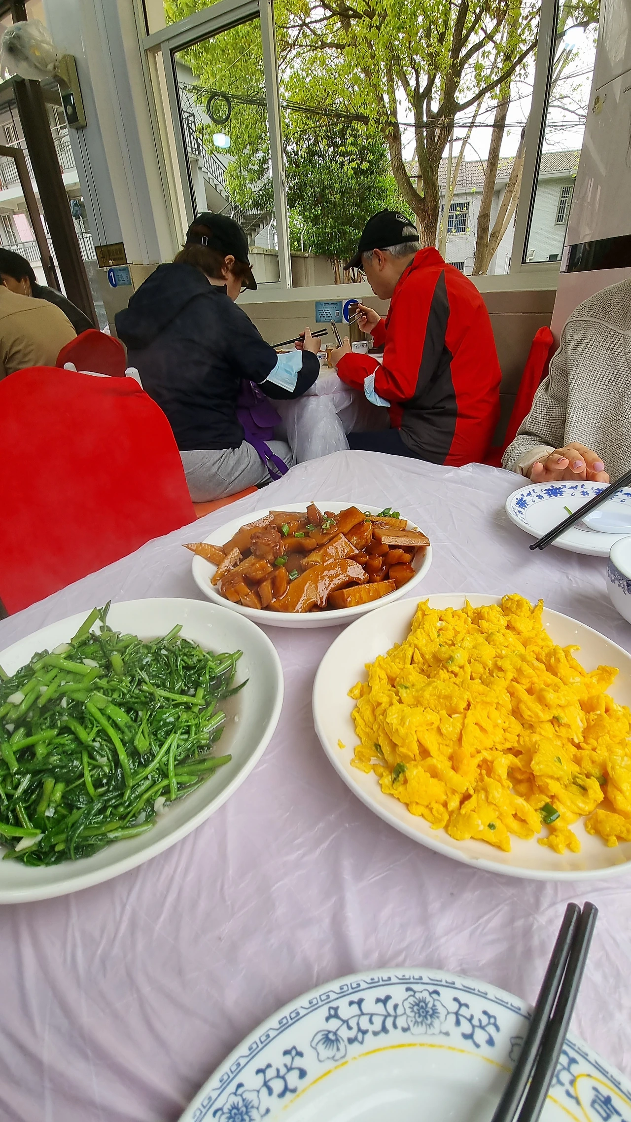 마침 도로변에서 옆집 할머니처럼 푸근한 인상의 다꽁(打工 호객꾼) 한 분이 근처의 사산 농가채(佘山农家菜) 식당으로 안내한다. 원형 식탁 예닐곱 개가 놓인 자그마한 식당 창가에 앉아 옆 테이블로 곁눈질을 해가며 계란 스크램블(土鸡蛋) 죽순 고기볶음(笋烧肉) 콩씬차이(空心菜) 왕라오지(王老吉) 등 반찬 밥 음료를 시켰다.