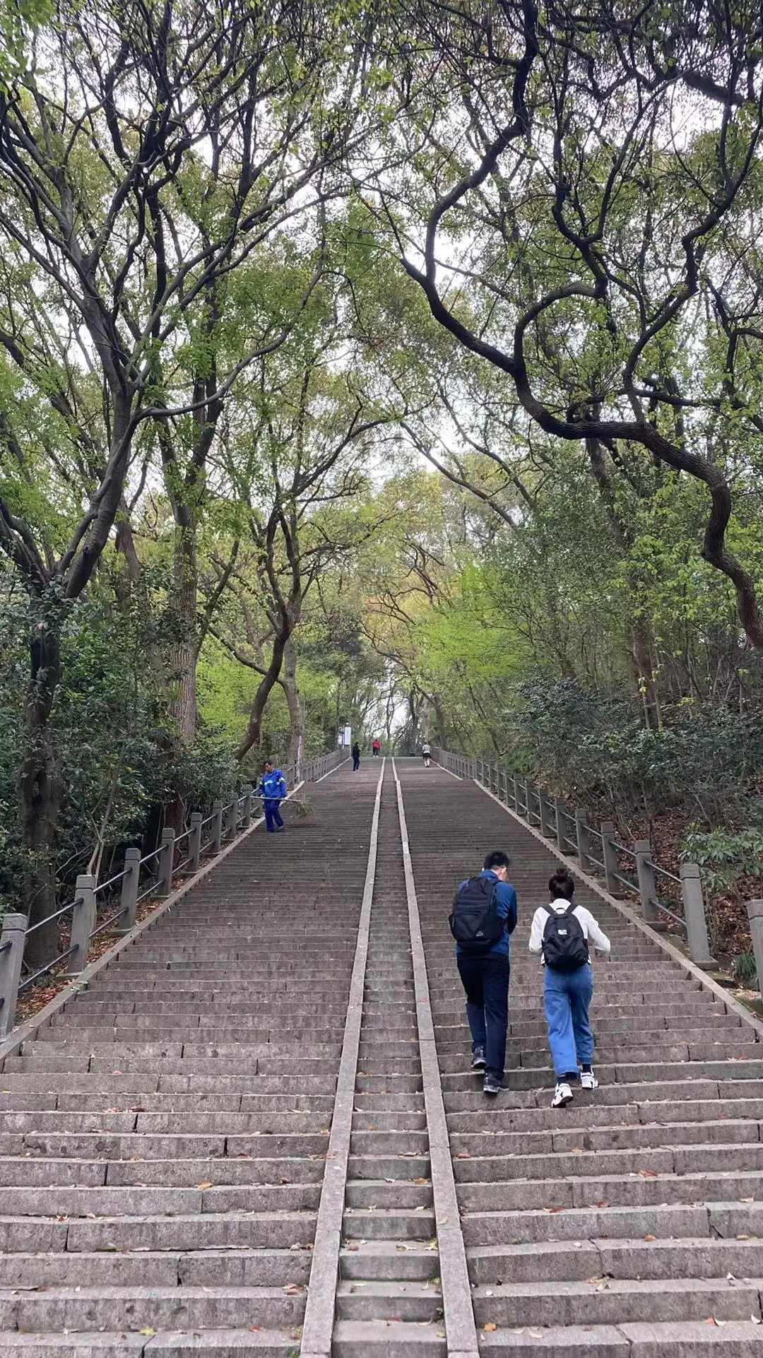 연못 위 돌다리를 건너니 산정 중간까지 368개 계단과 그 위로 이어진 끝이 보이지 않는 계단이 눈앞에 나타난다. 한 발 한 발 너른 계단을 오르는데 시원한 미풍에 양쪽의 무성한 녹나무(香樟, Cinnamomum camphora) 고목들이 우수수 잎사귀를 떨군다.