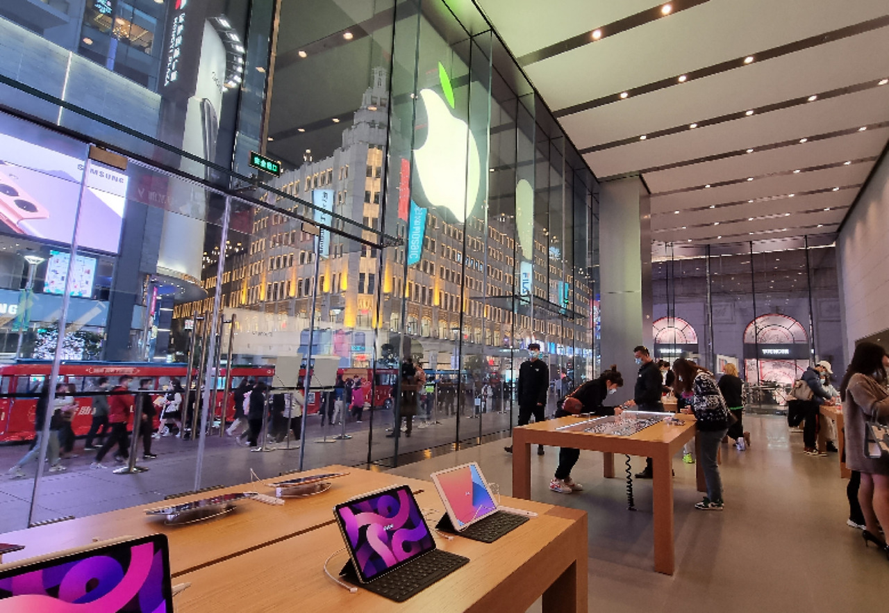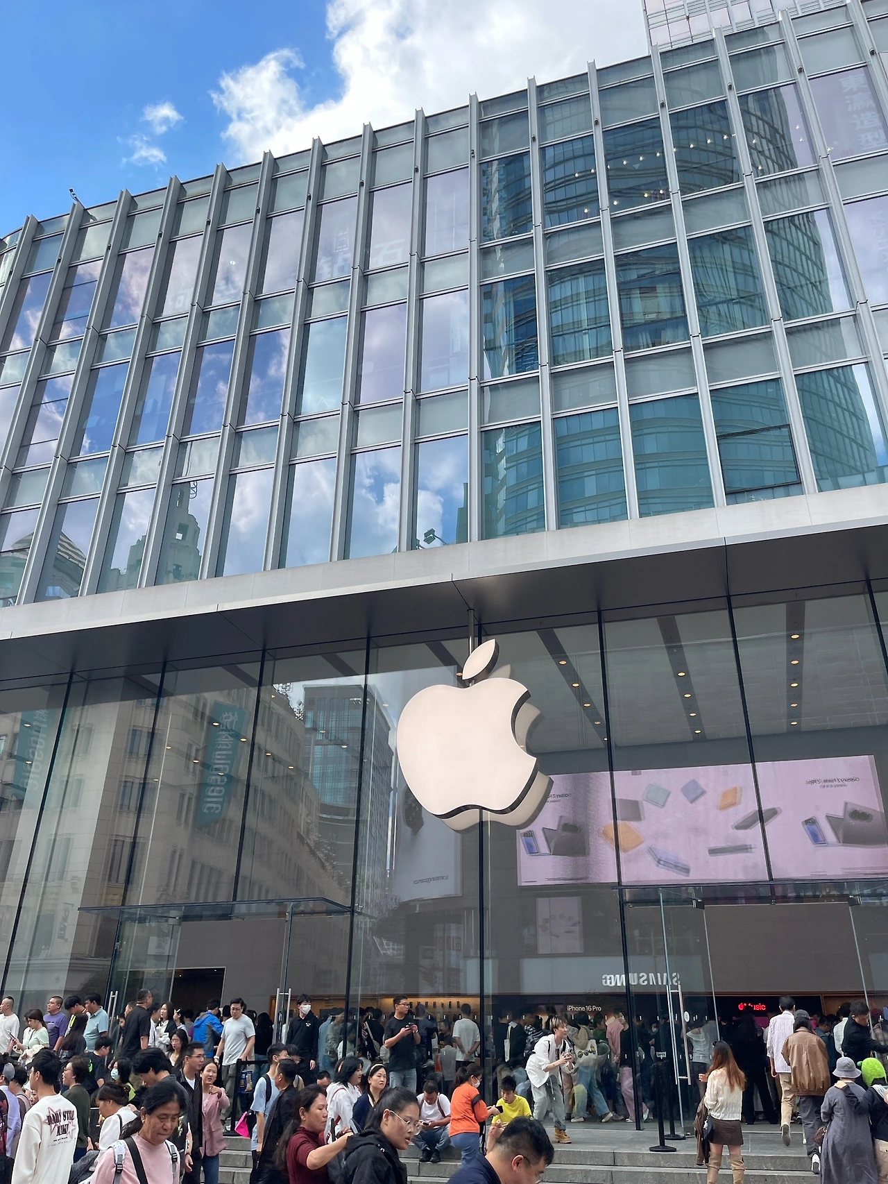와이탄 쪽을 등지고 허난 중로를 건너면 보행자 거리 초입에서 상징 조형물이 맞이한다. 그 우측 항기(恒基) 빌딩 1층 미국 애플의 대형 스마트 폰 매장에는 많은 손님들로 북적인다. 보행가 쪽으로 낸 전면 유리창이 가시 공간을 바깥으로 확장하여 넓은 공간이 더욱 넓어 보인다. 허난중루 건너편 화웨이 매장도 크고 넓기는 마찬가지다.