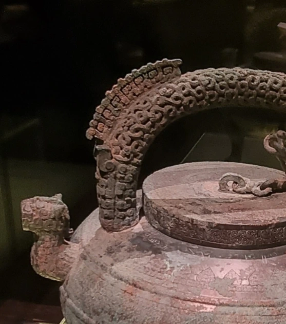 춘추전국 시대 코너로 넘어오니 둥근 몸통, 거북 머리 모양 주둥이, 세밀한 용 몸통 문양의 손잡이가 돋보이는 술 주전자 하나가 발길을 잡는다. 춘추 말기(BC6C초~BC476년) 오왕(吴王) 부차의 술병이라고 한다.