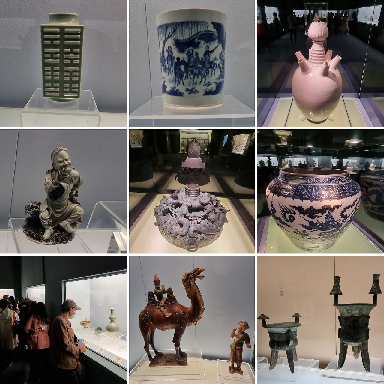 허베이 곡양(曲阳)에서 10C 초반부터 제작되기 시작한 도자기는 채색이 없고 문양도 극히 단순 질박하다. 12~13세기 남송 때 저쟝성 롱촨(龙泉)에서 만든 푸른빛이 도는 도자기 앞에서 많은 사람들이 둘러서서 해설사의 설명을 진지하게 듣고 있다.
