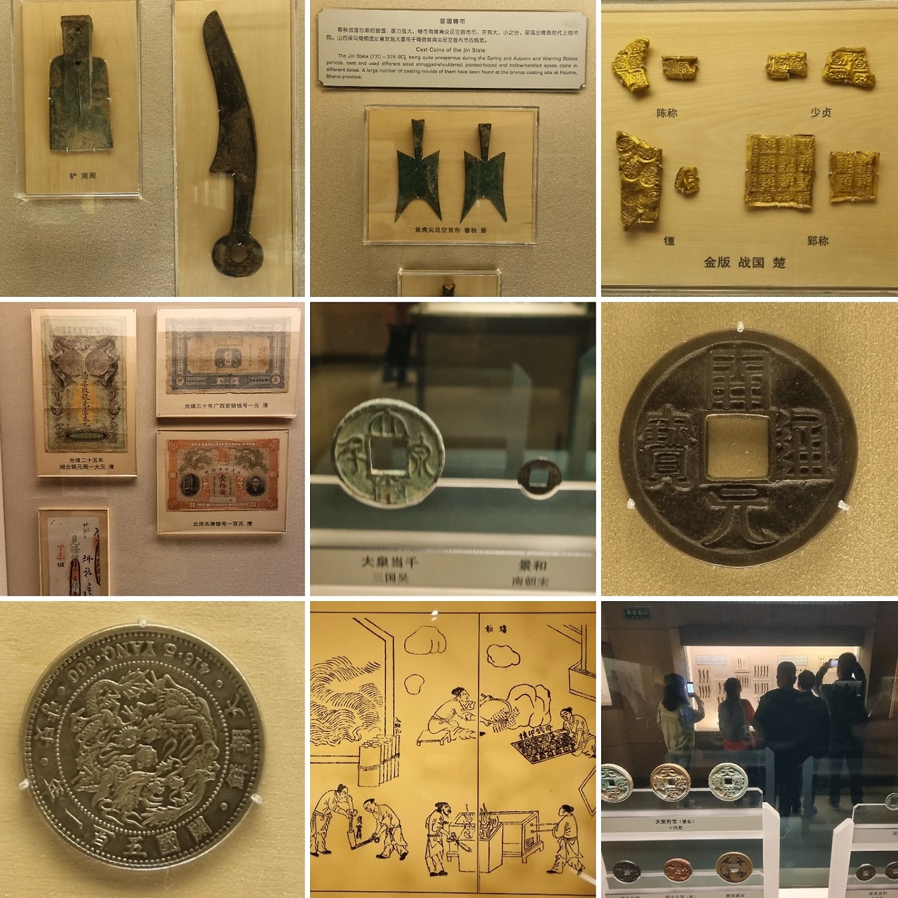 4층 화폐관 화폐관으로 들어섰다. 주상(周商) 시대에 나타난 쇳돌(鑛) 칼 등 실물 모양의 최초 화폐가 두세 점 전시되어 있는데, 주왕조 때 주조 화폐가 출현했다는 설명이다. 진한조위(晋韩赵魏) 등 춘추전국 시대 여러 나라들이 각기 독자적인 화폐를 만들어 사용했고, 위(魏)와 조(赵)에서 주조되기 시작한 가운데 구멍이 뚫린 원형 동전이 전형적인 화폐로 오랫동안 사용되었다.