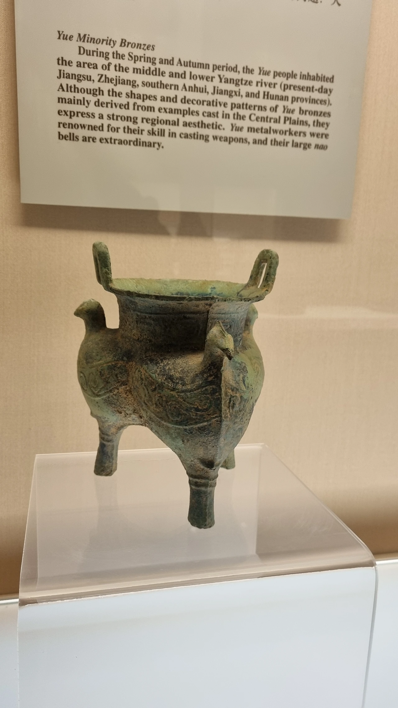 춘추전국 시기 장강 하류 이남에 분포했다는 월족(越族) 청동기도 몇 점 전시되어 있다. 세 마리 비둘기 머리 모양 장식이 있는 담박한 식기(饮食器)가 화려 과장 웅장 기교 등이 듬뿍 담긴 다른 청동기들과 달리 왠지 모를 평온함을 준다.
