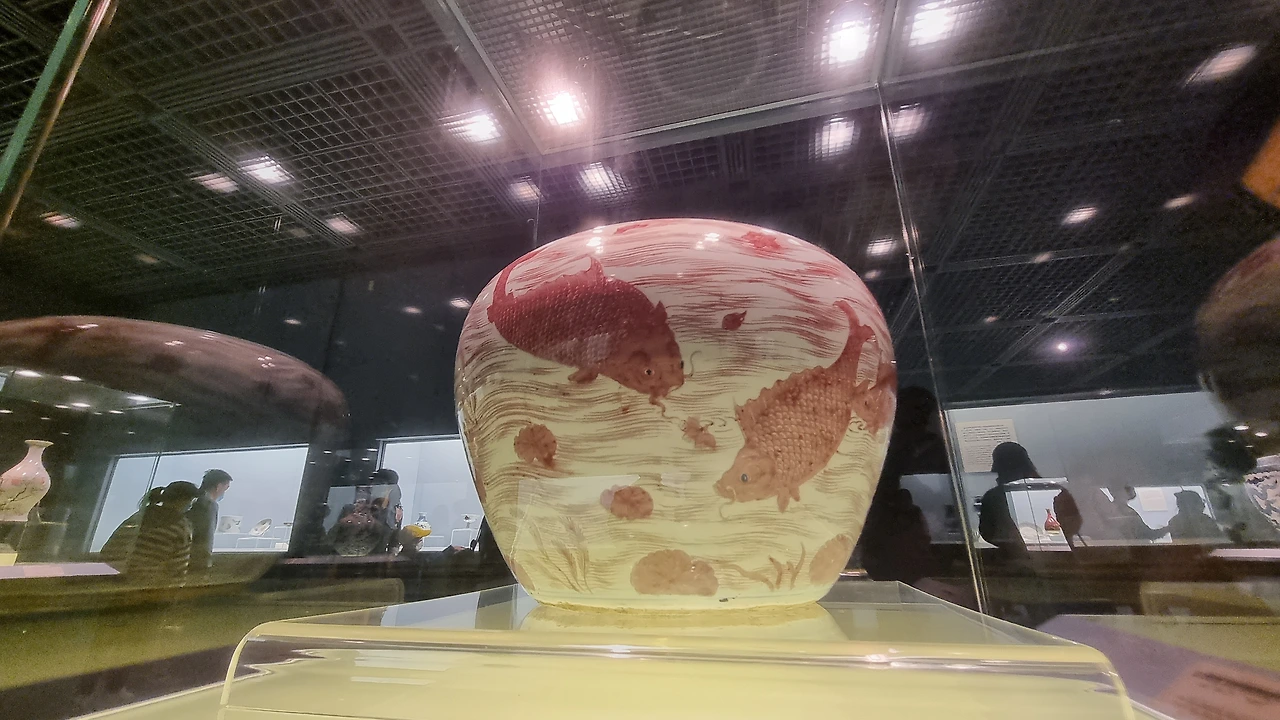 그중에 잉어가 몸을 비틀며 거친 물살을 힘차게 거슬러 올라가는 모습을 붉은빛 채색으로 큰 항아리 모양 도자기에 담아낸 '유리홍어조문항(釉里红鱼藻纹缸)'이라는 작품이 특히 오래도록 눈길을 잡아 두고 주위를 맴돌게 만든다.
