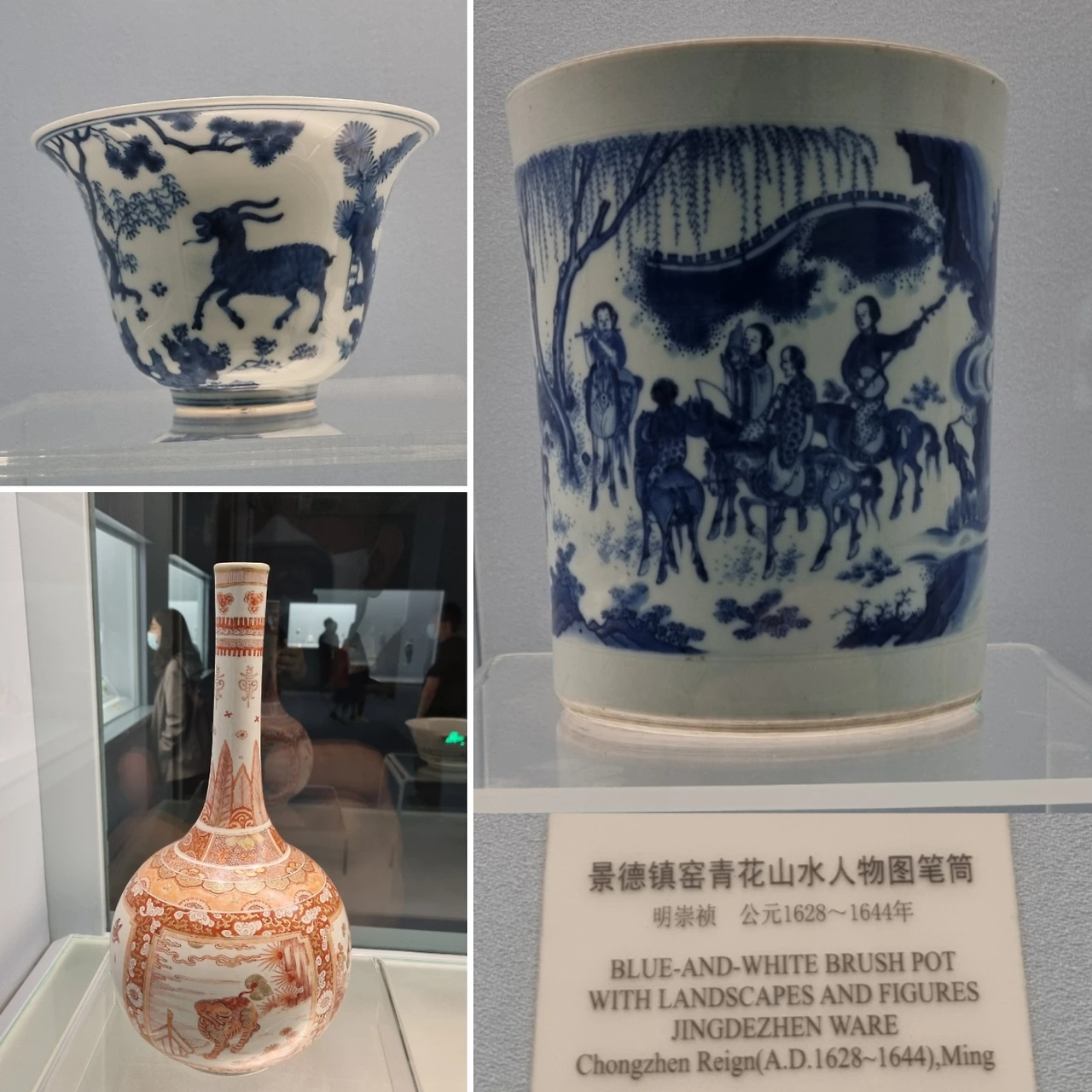 17세기에 제작된 청화 산수인물도(青花山水人物图) 필통, 오채 낙화유수도(五彩落花流水图瓶), 오채 대비초친도(五彩对备招亲图瓶) 등 산수 인물 어류 동물 화초 등을 푸른빛 물감으로 담아낸 도자기들이 감탄을 자아낸다.
