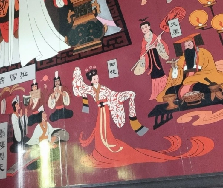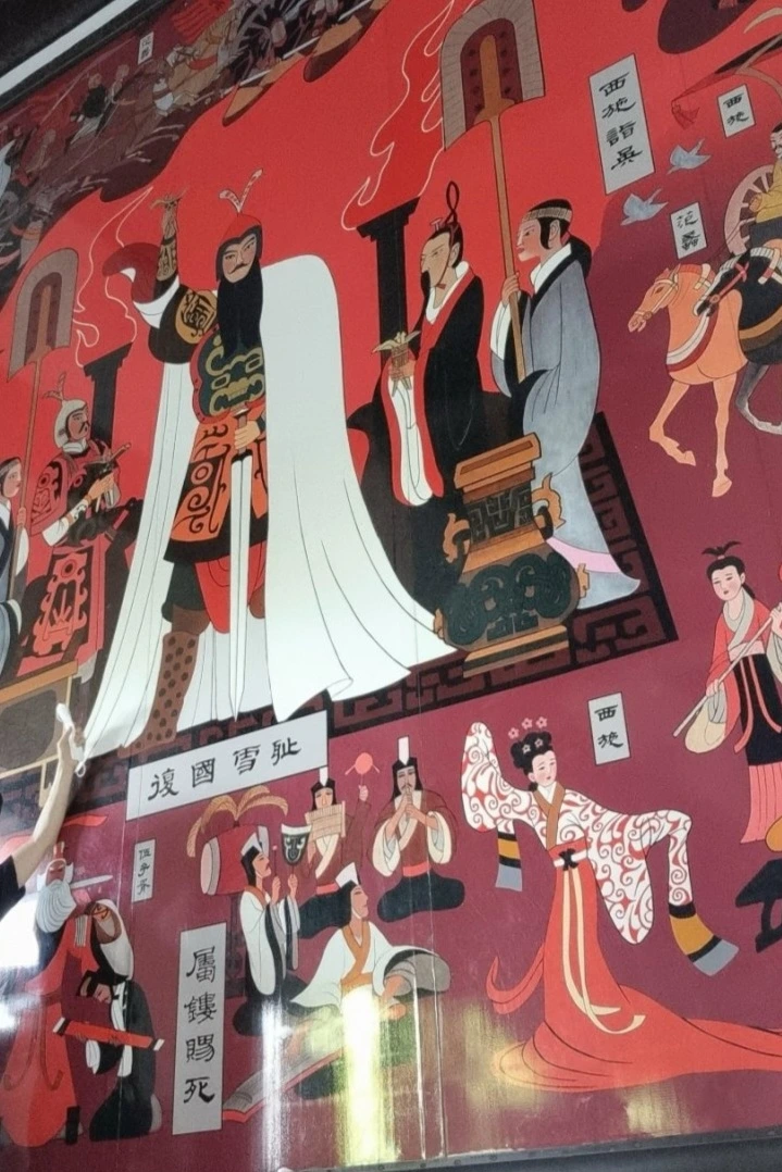 반대쪽 벽면 오나라 왕 부차에게 복수를 하고 나서 축배의 잔을 높이 치켜든 의기양양한 구천과 그의 책사 문종과 범려, 부차에게 접근해 오나라 재정을 탕진시킨 범려의 애첩이었던 서시(西施) 등의 모습을 세밀한 필치와 화려한 색상으로 그려낸 화공의 솜씨가 놀랍다.