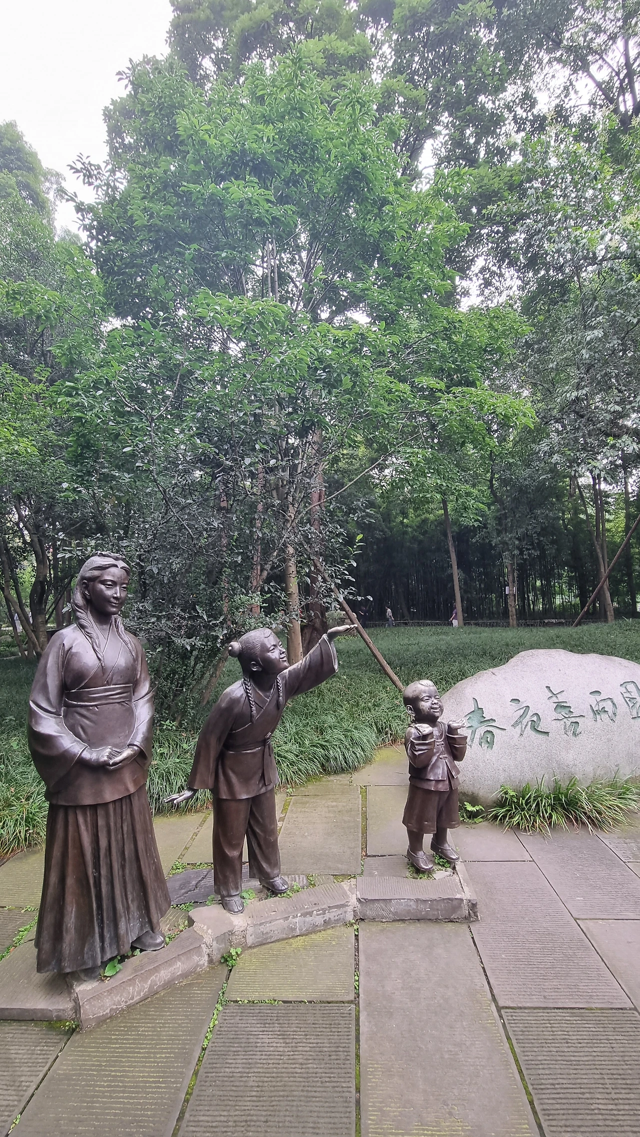 그루터기 느티나무 밑동처럼 뿌리를 한 곳에 두고 수십 개 줄기와 가지를 하늘 높이 뻗친 무성한 대나무 군락들, 두보의 시를 적은 바위와 담장, 높고 낮은 정자들, 여러 모습의 두보 像, 화려한 꽃무늬 비단잉어들이 유영하는 연못, 그 속을 거니는 관람객들,...