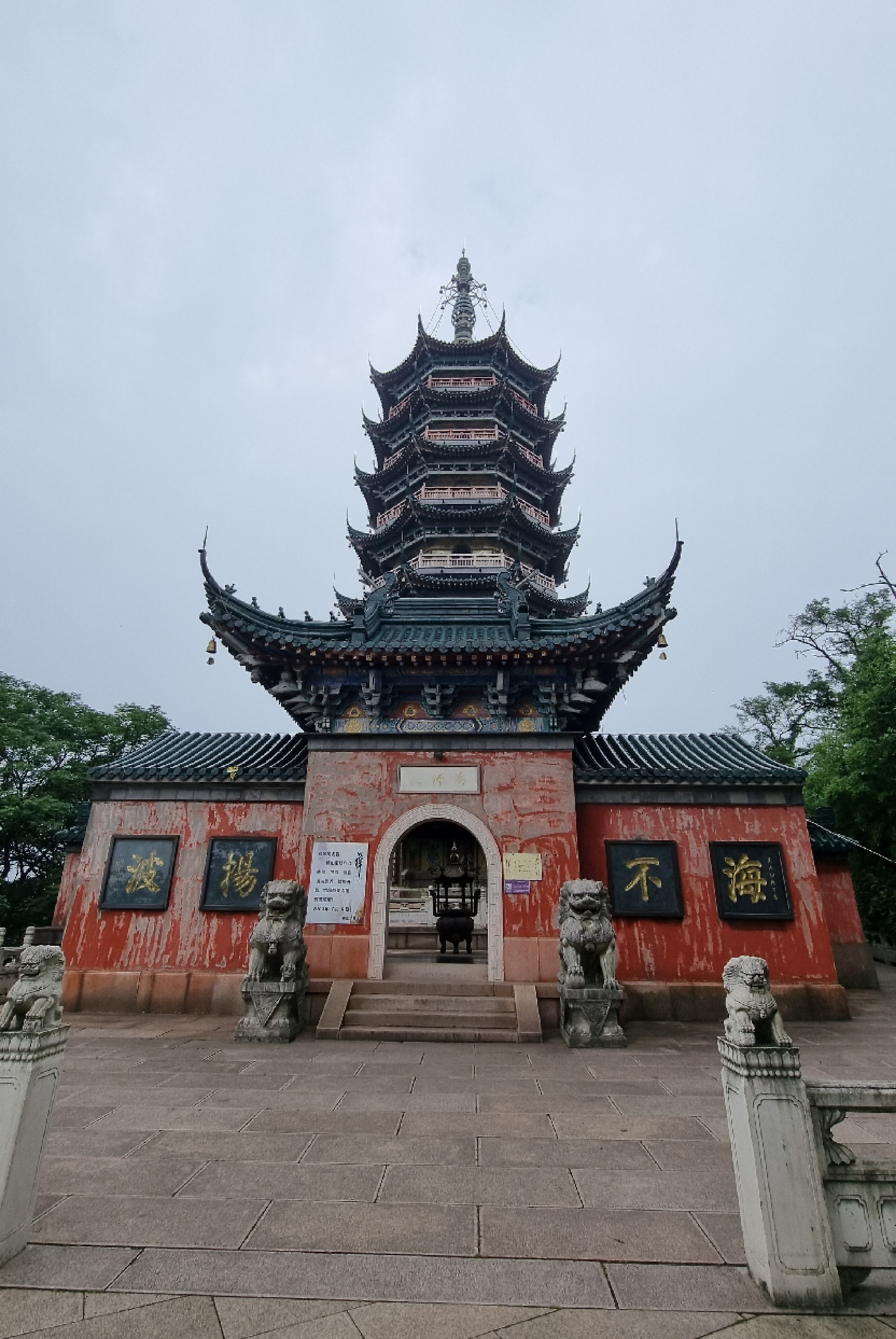 계단을 따라 산정으로 오르니 원나라 때인 1307년에 건립되었다가 훼손되어 1999년 재건했다는 7층 8각 회안사 만불탑이 우뚝 솓아 창쟝을 굽어 보고 있다. 기단 전후 벽면에 각각 '해불양파(海不扬波)', '중류지주(中流砥柱)'라는 글자가 쓰여 있다. 전자는 주나라 주공(周公) 때처럼 태평성대가 지속되기를 기원하는 것이요, 후자는 난세나 역경에도 지조와 절개를 잃지 않는 의연함을 격류에도 흔들리지 않고 우뚝 솟아 있는 황하의 지주산에 빗댄 것이다. 우리나라에도 고려 말 충신 야은 길재(吉再)의 충절을 기리는 지주중류비(砥柱中流碑)가 그의 고향인 구미에 남아 있다.