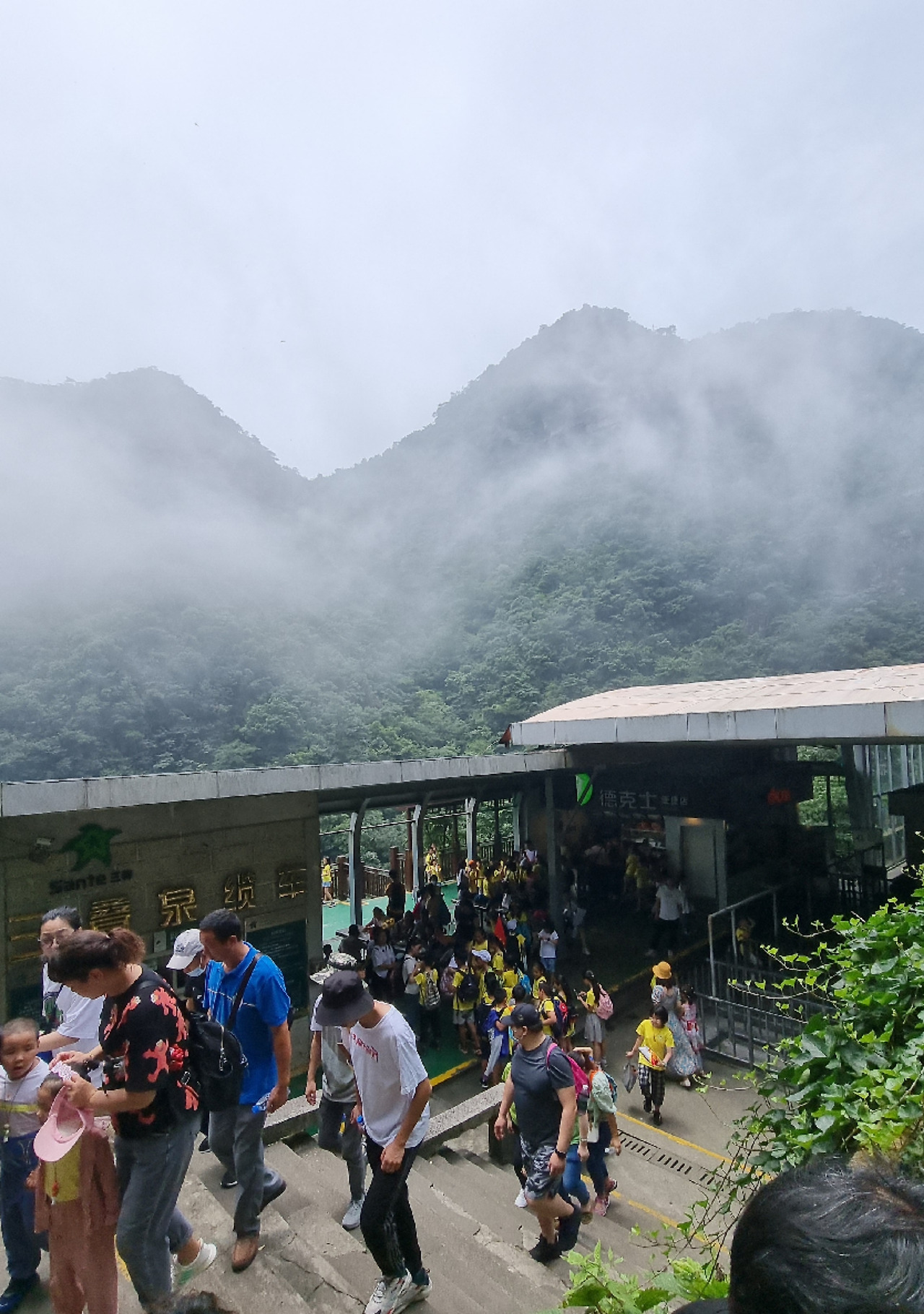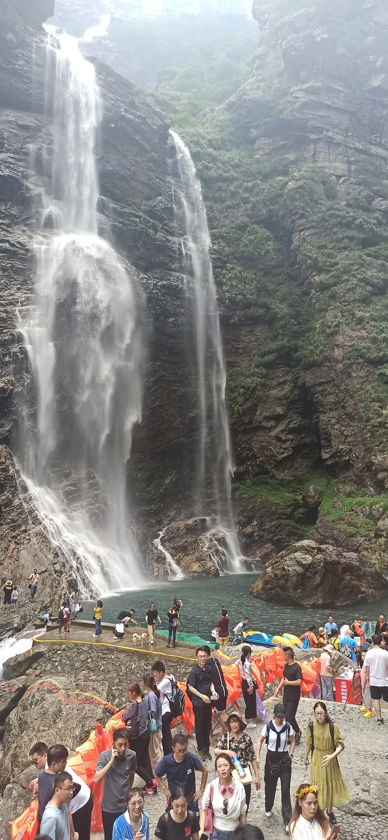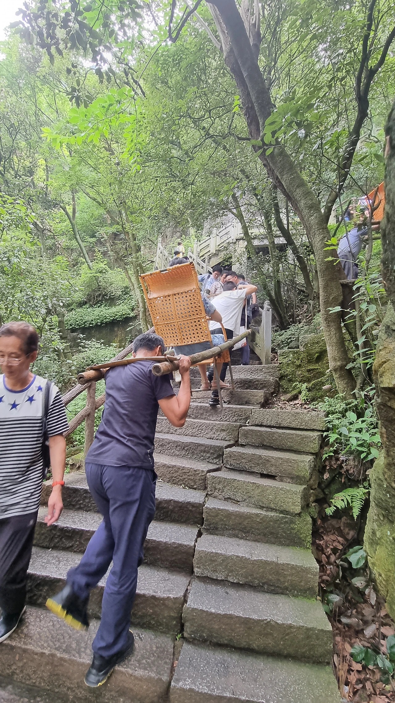싼디에촨 정류장에서 내려서 계곡 사이로 난 레일 차로 10여 분을 내려간 후, 좁은 계곡 수 천 개의 좁고 가파른 계단을 따라 싼디에촨(三叠泉) 폭포로 내려갔다. 남녀노소 관람객들이 땀과 습기에 젖은 채 힘겨워하며 좁고 가파른 계단을 오르내리고, 군데군데 가마꾼들은 배를 드러낸 채 편한 자세로 드러눕거나 앉아서 손님을 기다리는 모습도 보인다.