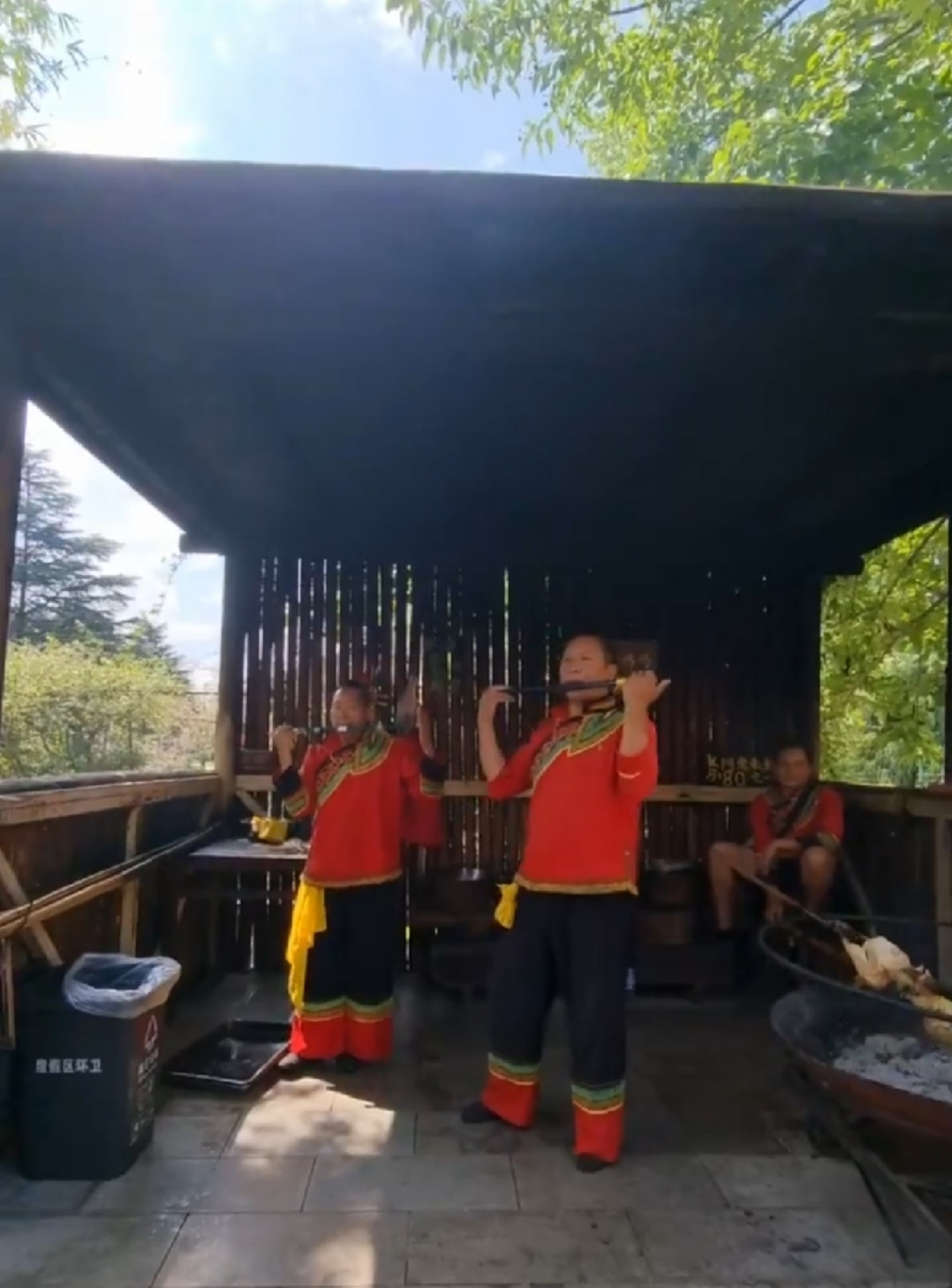 고대 강족(羌族)의 후예로 량산(凉山) 자치주에 주로 거주한다는 이족은 중국에서 일곱 번째로 인구가 많은 민족으로 300여 종의 전통복장이 있다고 한다. 뜨락에 큰 술항아리가 놓인 가옥 안을 둘러보고, 통닭 바비큐를 화로 위에 걸어 놓은 마당 옆 움막에서 이족 남성 두 명이 피리로 연주하는 전통음악에 한참 동안 귀를 기울였다.