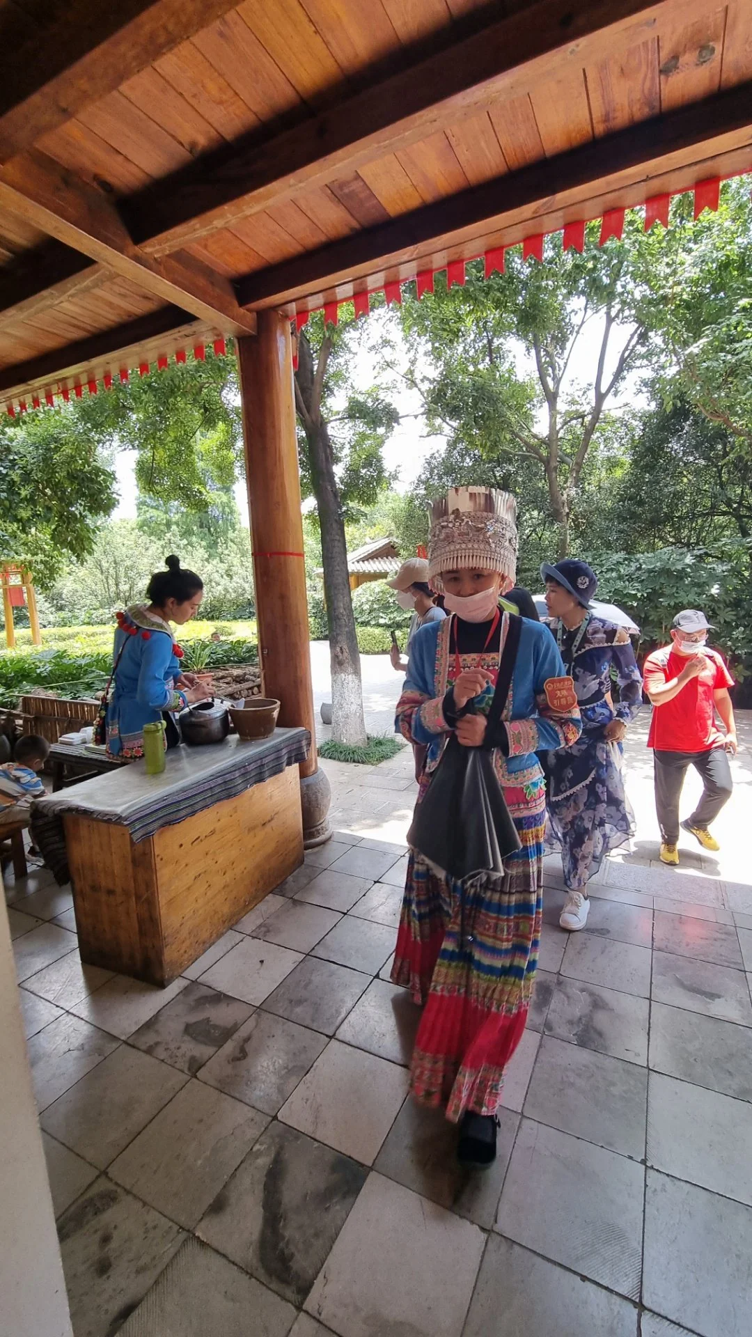 택시로 민족촌 북문에 도착해서 입장권을 90위엔에 구입하고 안으로 들어섰다. 이른 아침이라 민족촌은 고요한 정적이 흐른다. 선홍색 의복 구슬 장식 모자를 쓴 이족(彝族) 처자가 바로 옆에 위치한 이족 마을 방향을 일러주고 재빠르게 지나간다.