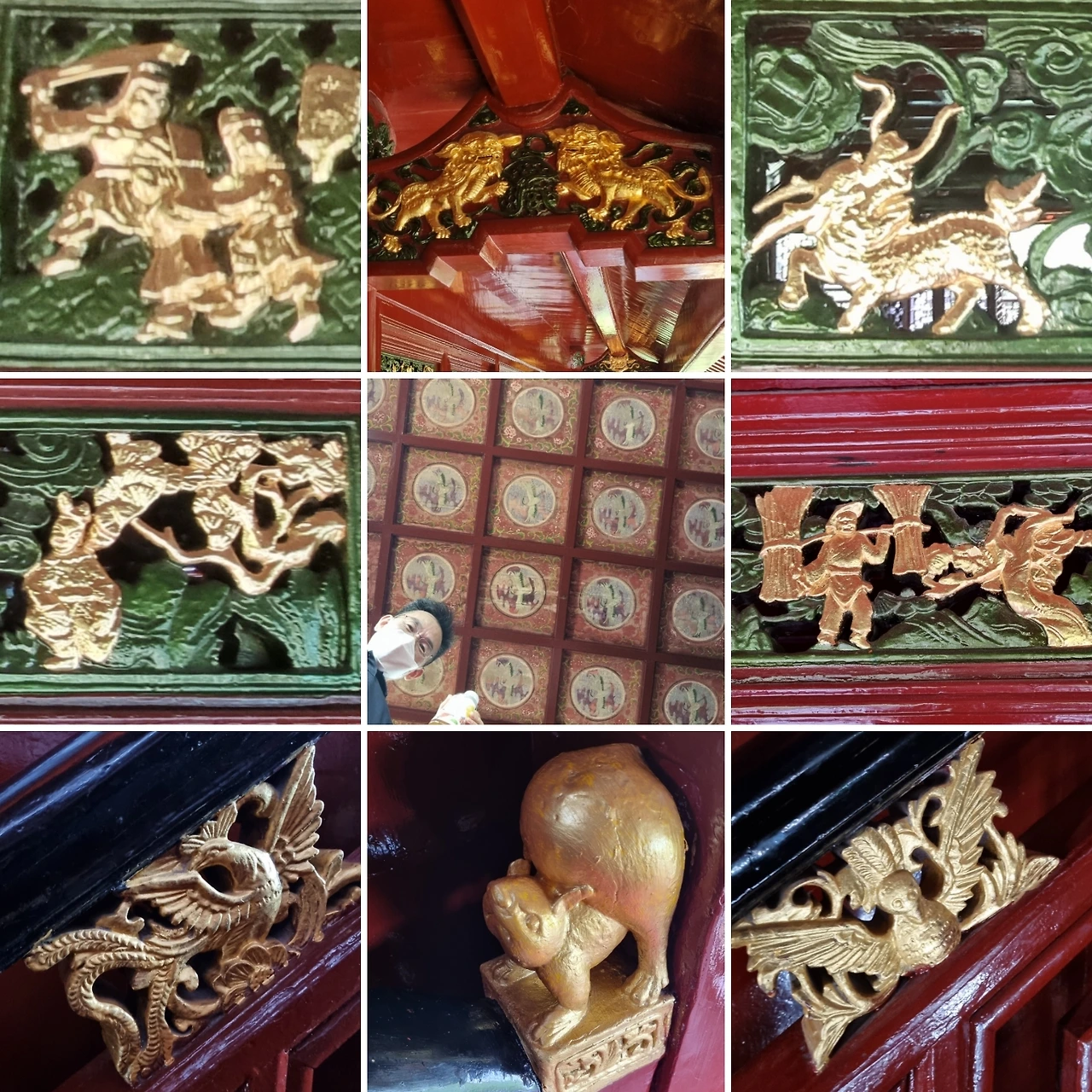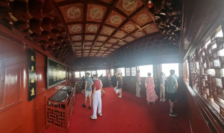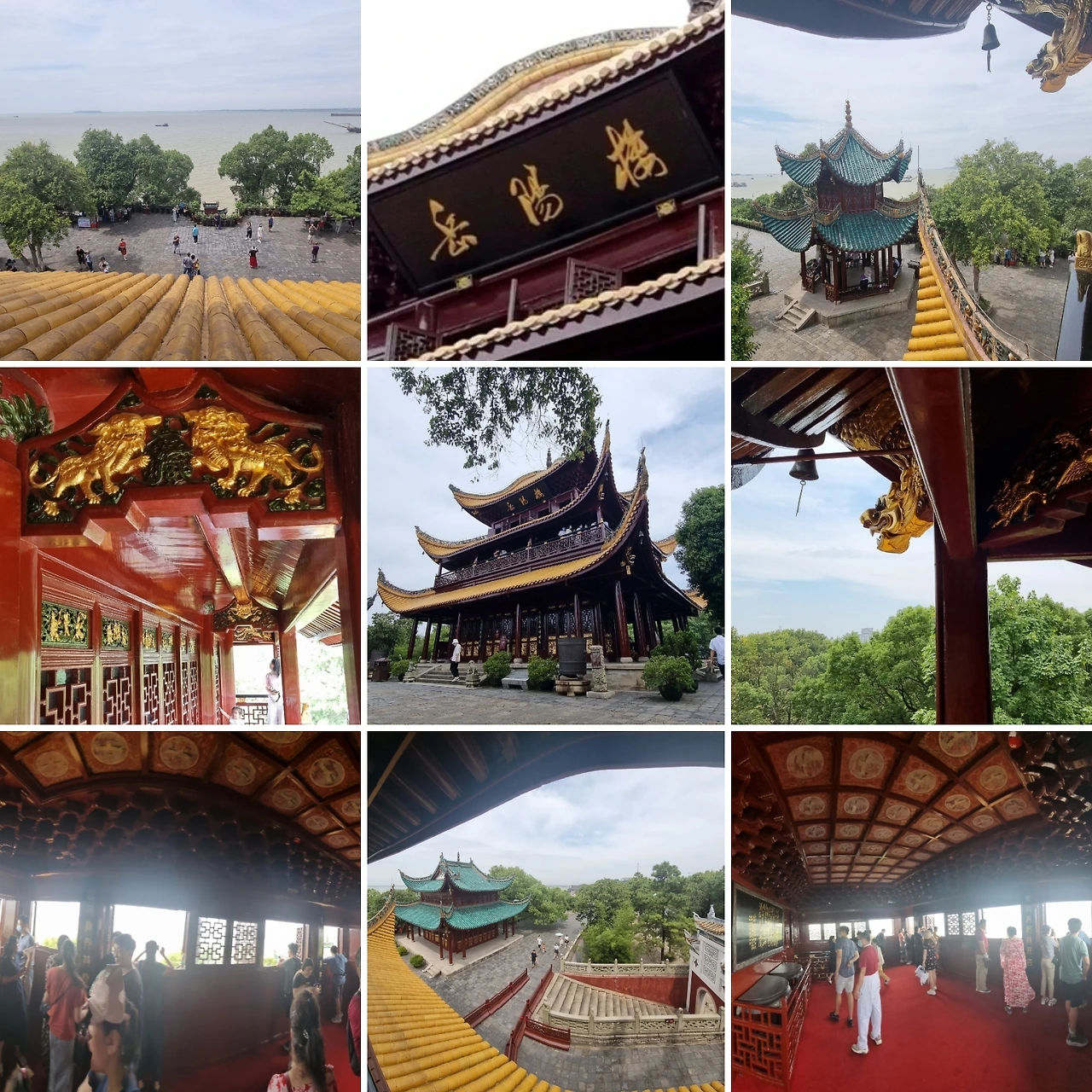 층층 계단 손잡이, 난간, 창틀, 벽면, 처마, 천장 등 세세한 부분까지 인물상, 동물, 도깨비, 사자, 봉황, 문무신, 악사 등 각종 조각상이 장식되어 있어 한눈에도 장인이 쏟아부은 지극한 정성을 알아챌 수 있다. 사방 둘레의 경관을 조망할 수 있는 난간으로 나서니 팔을 치켜들면 처마 석가래가 손에 닿는 것이 마치 우리나라 옛 정자에 올라온 듯 마음이 편하다. 동정호 쪽을 향해 서자 잔잔히 일렁이는 물결이 손에 잡힐 듯 지척에 다가와 있다.