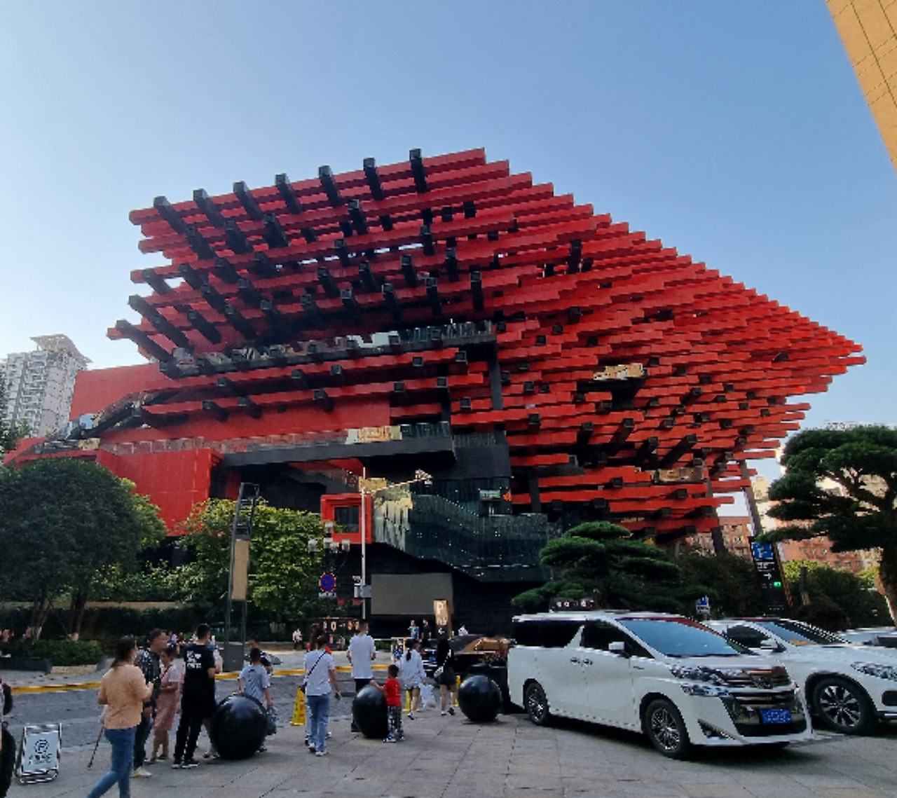린장먼(临江门) 역으로 되돌아와서 홍야동(红崖洞)으로 향했다. 가는 길에 만난 온통 새빨간색으로 치장한 웅장하고 독특한 디자인의 국태예술센터(国泰艺术中心) 건물이 오래도록 눈길을 사로잡는다. 대극원과 미술관으로 구성된 이 건물은 2013년 준공된 것으로 "서로 껴서 교차하고(穿插), 쌓아 올리고(叠落), 길게 늘어뜨리고(悬挑), 높이 맞받아 들어 올려(高高迎举), 자연스러움을 따른 것(顺势自然)이 충칭인들이 본질적으로 추구하는 정신을 잘 표현하고 있다."는 설명이 마음에 와닿는다.