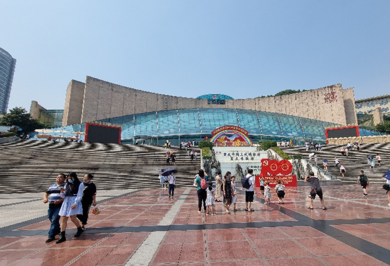 쟈링강(嘉陵江) 대교를 건너 위쭝취 산샤 박물관(三峡博物馆)에 도착했다. 북경의 천단과 흡사한 모양을 한 인민대례당 맞은편 계단 위 언덕에 자리한 박물관 앞에는 남녀노소 안으로 입장하려고 늘어선 줄이 벌써 장사진을 쳤다.