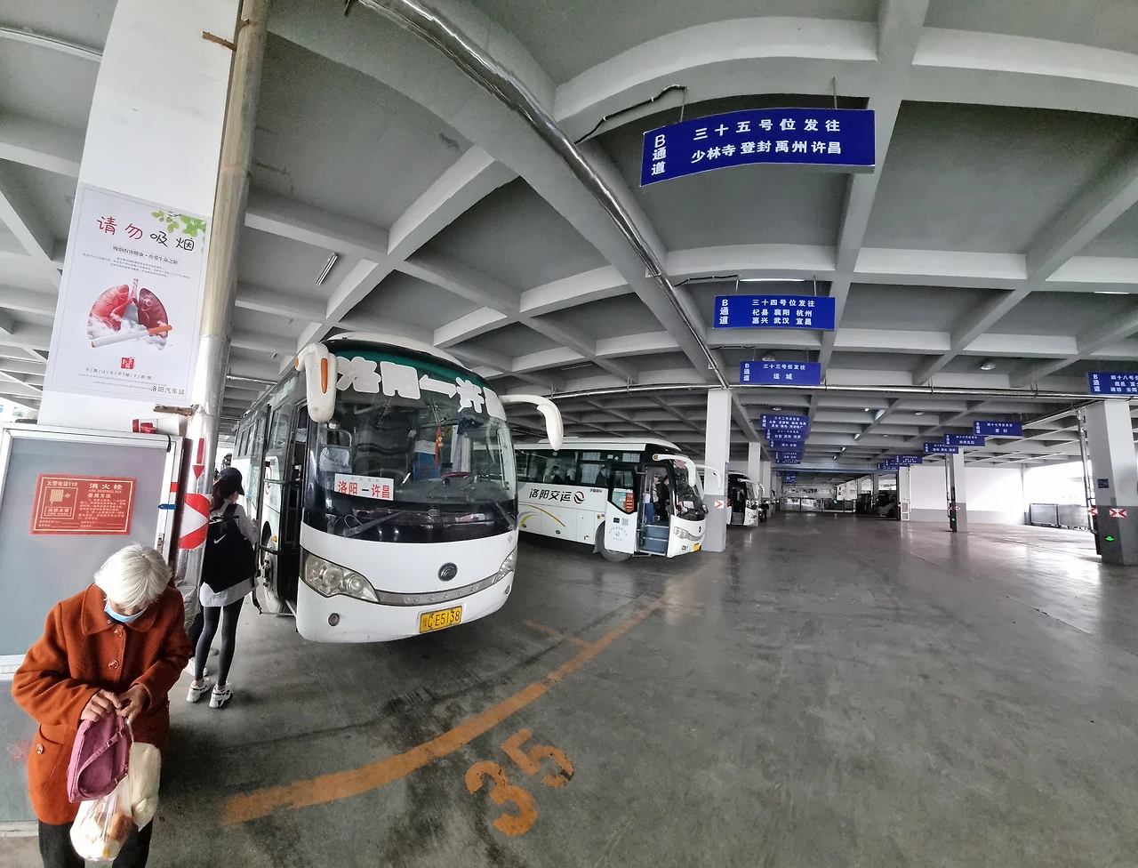 개찰구를 통과하니 벽이 없는 대형 창고처럼 생긴 건물 안 플랫폼마다 각지로 향할 버스가 승객들을 태우고 있다. 우리가 탈 버스는 소림사를 경유하여 허창으로 가는 버스로 소림사 입구까지는 약 2시간이 걸린다고 한다. 터미널을 출발한 낡고 느린 버스가 낙양성 동문을 나서서 중간중간 멈추어서며 한두 명씩 승객을 태우고 30여 분이 지나자 시내를 벗어났다.