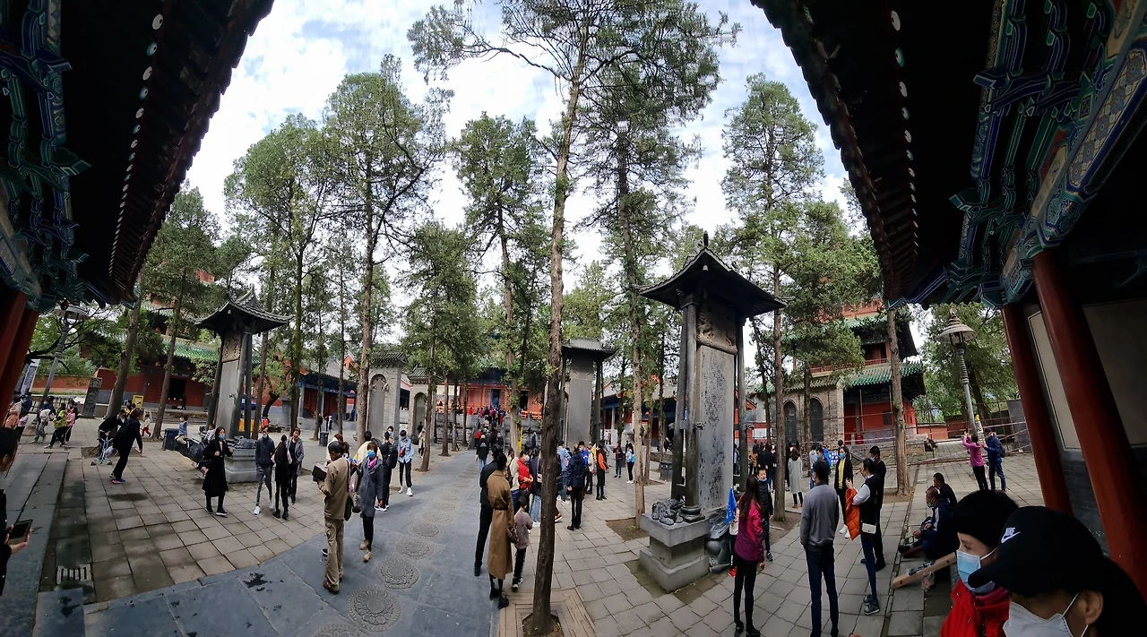 장경각 앞뜰 거북 기단 위 비석들은 두터운 벽돌 갑옷을 입고 있다. 대웅전 뒤편에는 특이하게 방장실이 자리하고, 그 뒤로 입설정(立雪亭)이 좌우측에 문수전과 보현전을 두고 자리하고 있다. 그 뒤편 '시방 성인(西方圣人)'이라는 세로 글자 현판이 걸린 도량(道场) 안 벽면에는 예닐곱 명씩 모여 담론 하는 구법 수도승 무리를 그린 빛바랜 벽화가 보이고, 돌 벽돌 바닥은 무도 수련의 흔적으로 움푹 꺼진 곳이 한두 군데가 아니다. 그 좌우측에 지장전과 관음전까지 규모와 격식이 있는 사찰의 형식을 두루 갖추고 있지만, 중국 여느 사찰에서 흔히 보이는 군더더기나 허장성세라고는 조금도 찾아볼 수 없다.