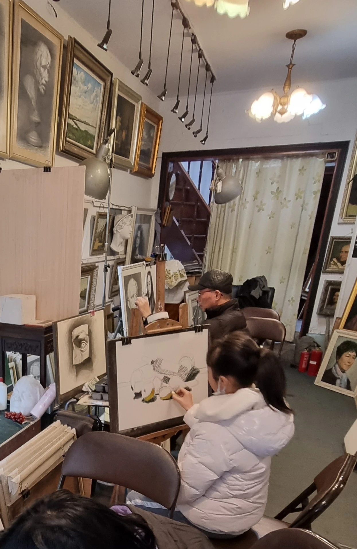 동강만로(东江湾路)에 접한 명인가 북문 쪽 100여 미터 거리 양편에는 서화점과 골동품점 등이 연이어 자리하고 있다. 그중 한 화실에서는 아이들 두 명과 노화가 한 분이 나란히 않아서 각기 캔버스에 시선을 고정하고 스케치에 집중하고 있다.