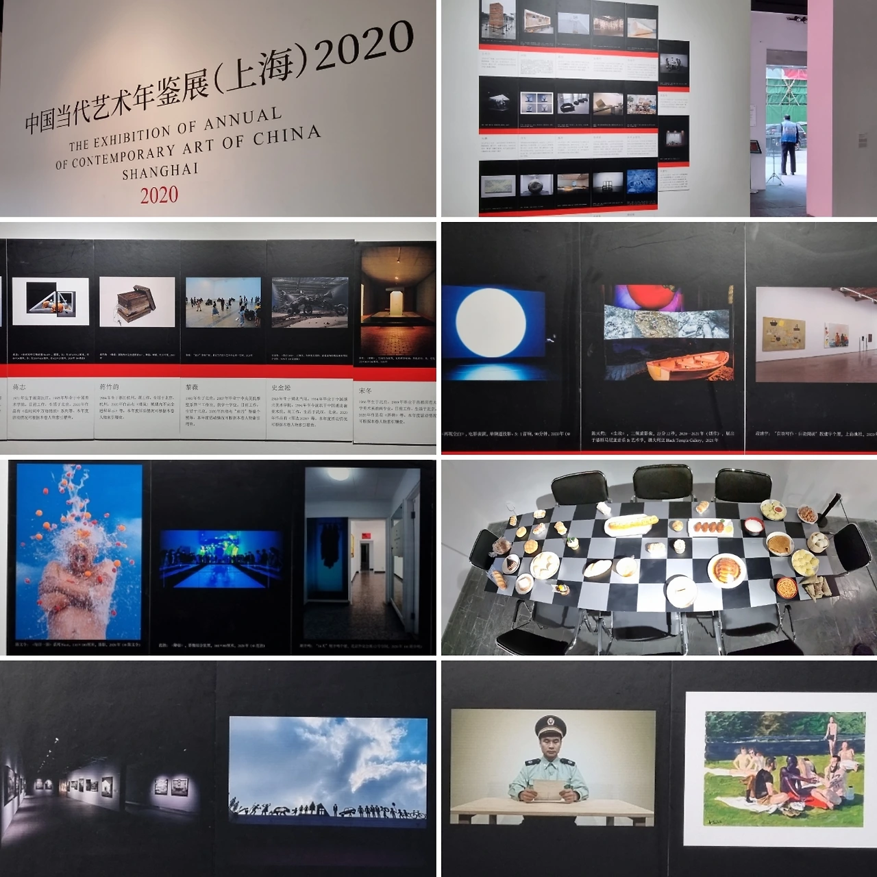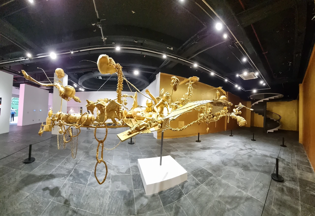 온갖 잡동사니들을 얽어 매어 거대한 곤충이나 비행체를 닮은 모양새의 금빛 조형물이 1층 너른 홀 중앙을 차지하고 있다. 칸막이로 구분된 벽면 쪽 탁자 위에는 2005년부터 2020년도까지 연도별 <중국 당대 예술 연감>이 나란히 놓여 있다. 그중 한 권을 들춰보니 연감을 한 페이지마다 하루씩의 전시 기록을 담는 독특한 형식을 취하고 있어 특이하다는 생각이 든다.