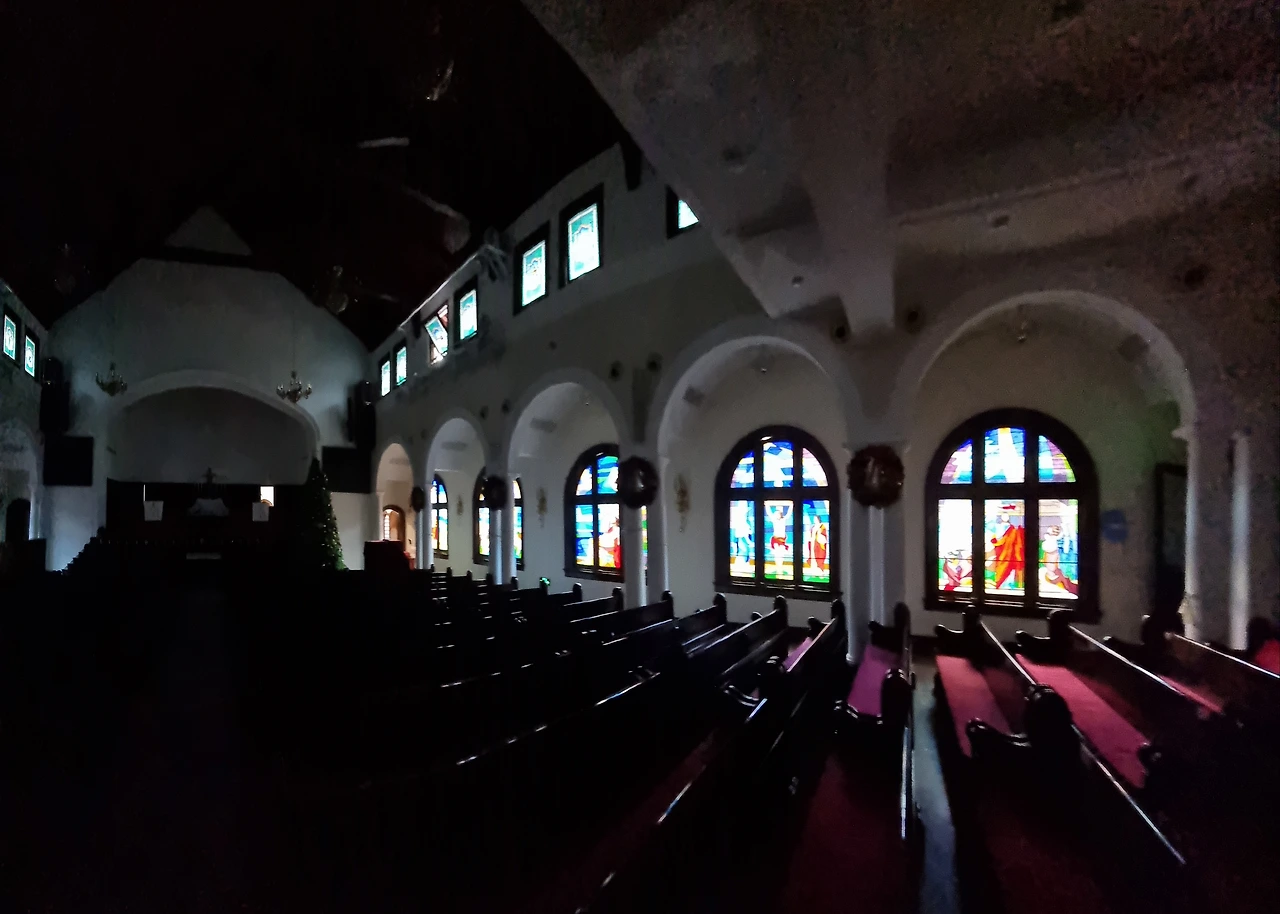 긴 벤치가 좌우로 줄지어 놓인 장방형의 너른 교회당 내부는 별다른 장식이 없이 심플해 보이고 흰색 벽면은 마음을 차분히 가라앉힌다. 좌우 벽면 높이 달린 창문의 스테인드글라스 성화들이 밖에서 쏟아져 들어오는 햇빛에 강렬한 색채를 어두운 실내로 드리운다. 벤치에 몸을 앉히고 잠시 두 손을 모았다.