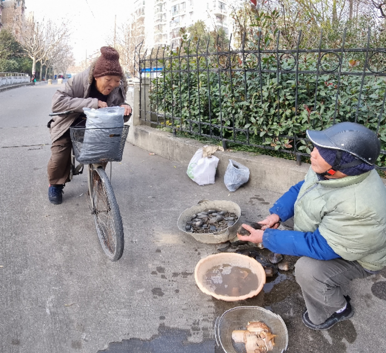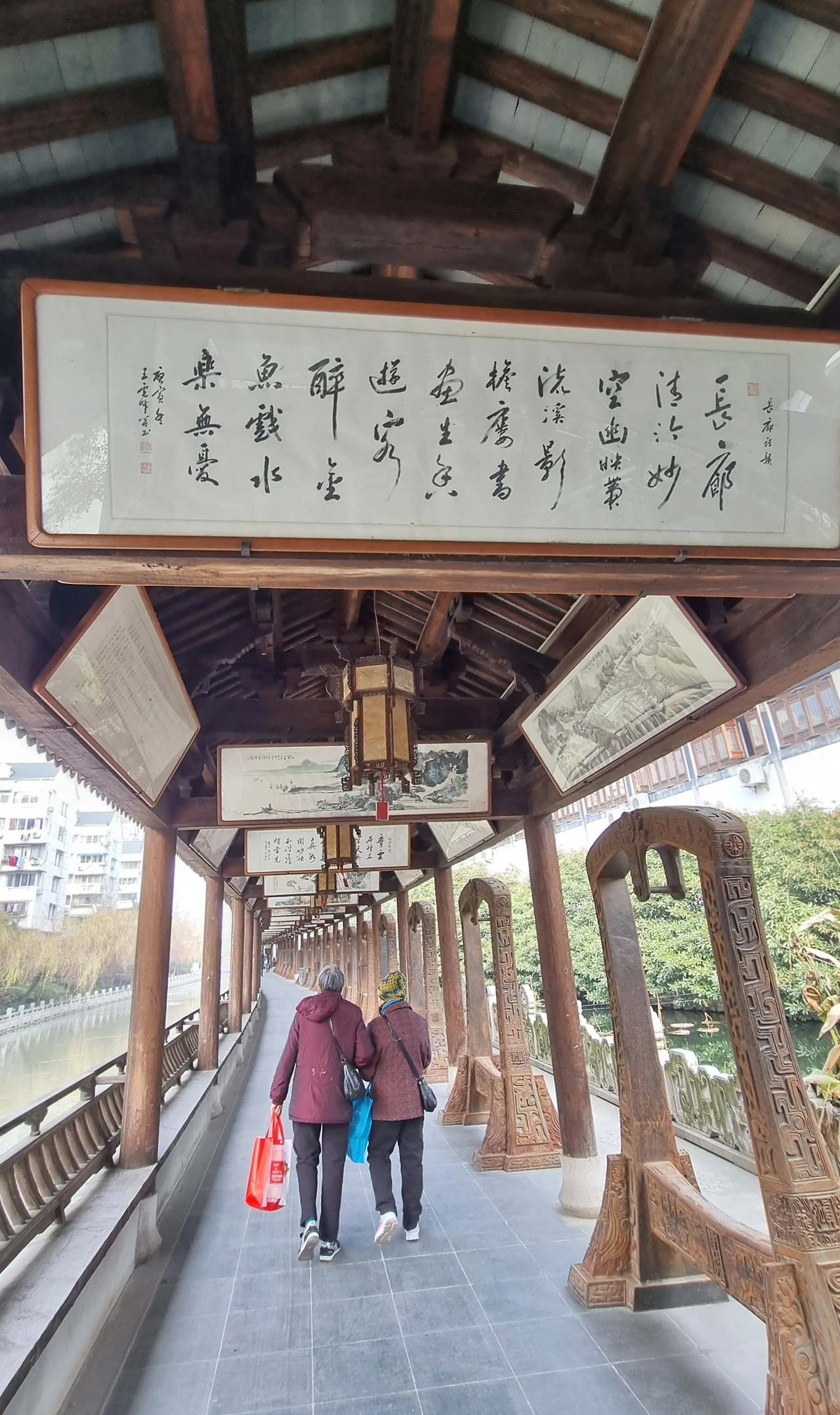 좁은 강 위에 놓인 다리 위를 행인들과 오토바이들이 연신 오간다. 다리 양쪽 편에는 롱징 차(龙井茶)를 파는 노인과 칭포(青浦) 갯벌에서 주웠다는 조개를 칼로 까고 있는 노인 등 몇몇이 자리 잡고 앉았다. 강변 산책로 건너편 작은 대나무 숲에 왜가리 등 여러 종류의 새들이 날개를 접고 앉아서 쉬고 있는 모습이 눈에 들어온다.