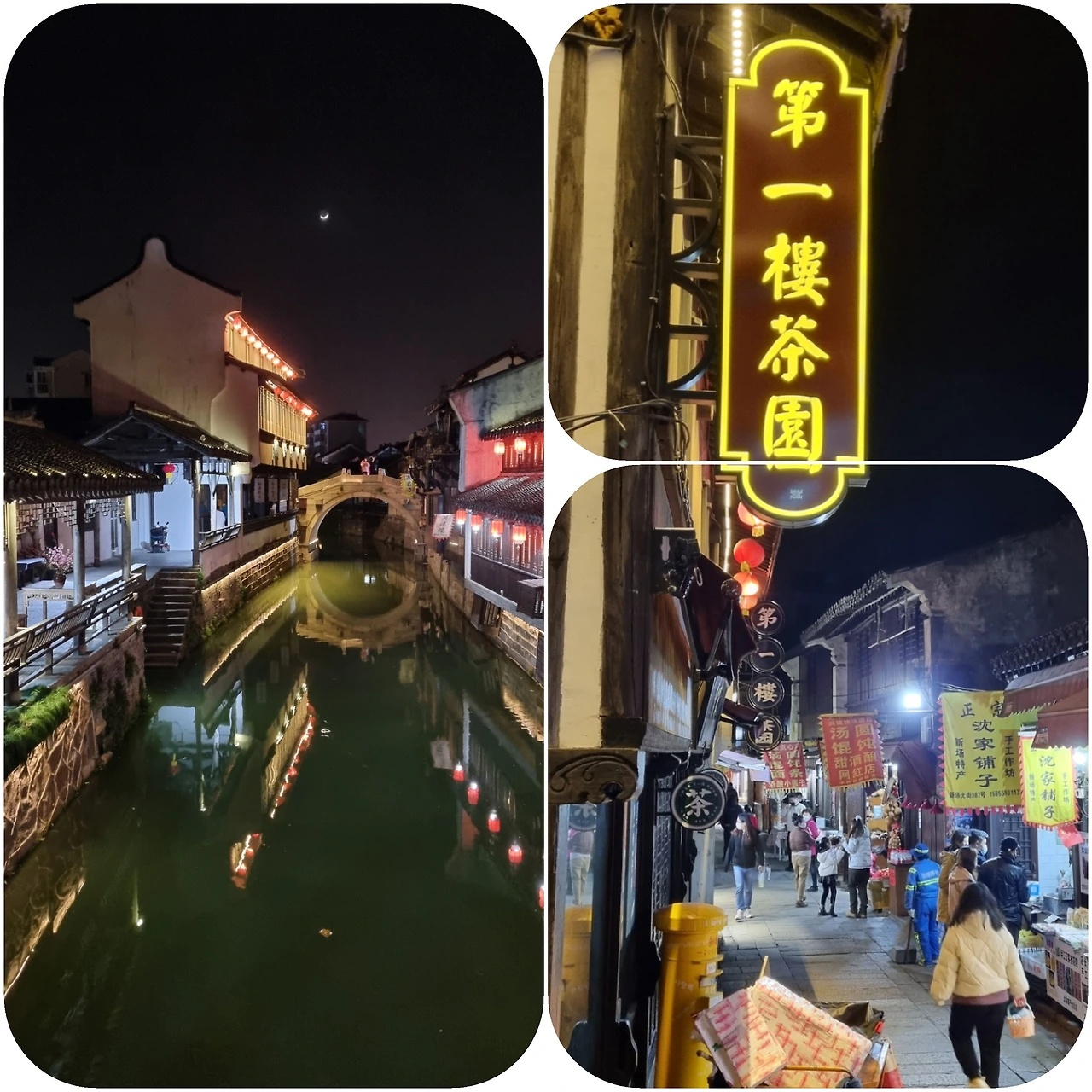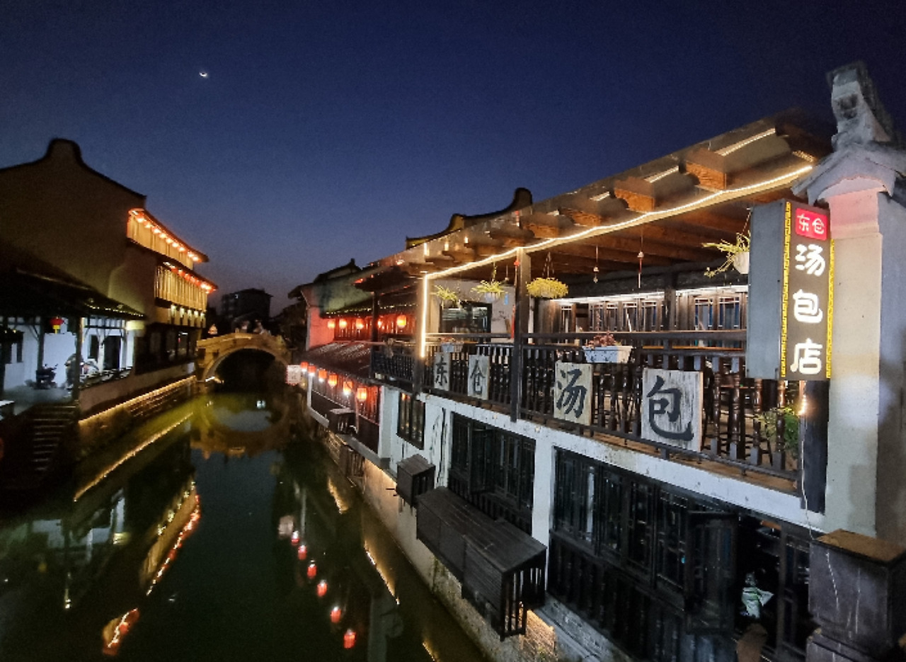 긴 수로 저편 서쪽 하늘에 떠있는 초승달을 보며 '달을 맞이하는 다리'라는 이름에 걸맞는 요월교(邀月桥)를 건너 수로 남쪽을 따라 난 허탕지에(河唐街)로 들어섰다. 죽 늘어선 식당들 중에는 상춘객들로 북적이는 곳도 있고 손님이 없는 일부 식당들은 하루를 마감할 채비를 하고 있다.