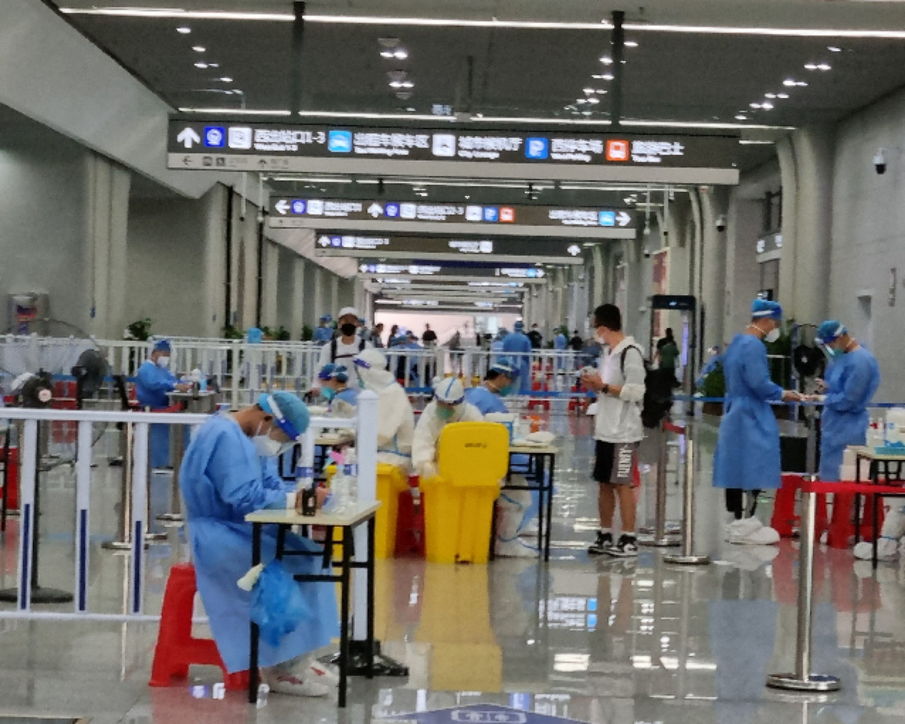 건물, 공원, 기차역 등을 출입할 때 확인 절차인 창쒀마(场所吗) QR코드를 휴대폰으로 스캔하고, 실명 검표소에서 여권과 기차표를 제시하여 검표를 하고, 엑스레이 짐 검사와 신변 금속탐지기 검사 등을 거쳐 출발 홀로 들어설 수 있었다. 축구장 예닐곱 개 넓이의 대합실은 두 달간 봉쇄에서 풀려난 도시답지 않게 대륙 각지로 가는 열차를 기다리는 사람들로 인산인해다. 등 뒤편 의자를 차지하고 앉은 여학생들이 깔깔 웃음을 곁들이며 수다를 떠는 목소리가 높고 경쾌하다.