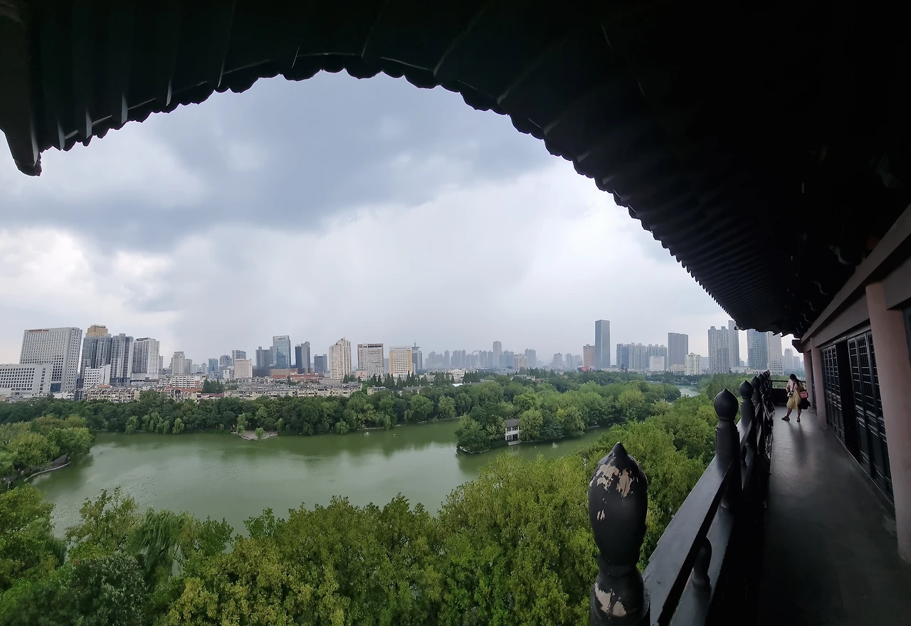 포공의 대형 목각 부조가 맞이하는 1층에서 엘리베이터를 타고 5층으로 올라 누각 둘레의 난간으로 나갔다. 사방으로 툭 트인 전망은 허페이 시내를 동서남북으로 멀리까지 펼쳤고, 호쾌한 바람이 거침없이 누각 난간으로 몰아치며 온몸을 때린다. 멀리 시내의 빌딩군이 비구름에 휩싸였고 누각 난간 모퉁이를 돌아설 때마다 바람은 방향을 바꾸며 바지통을 부여잡고 흔들며 머리칼에 스며든 습기와 땀을 씻어간다. 그 바람에 몸을 짓누르던 더위와 짜증은 물론이요 오늘 하루 새벽, 아침, 그리고 점심시간이 훌쩍 지난 지금까지 가슴 조이던 걱정들이 일거에 흩어져 버릴 것만 같다.